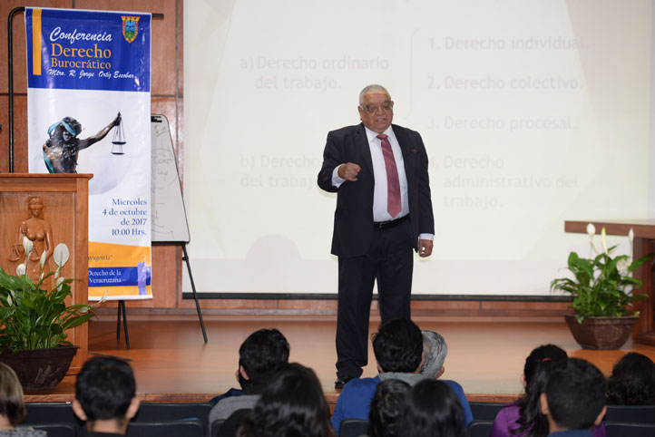 12/10/2017, Xalapa, Ver.- Jorge Ortiz Escobar, ex director de la Facultad de Derecho de la Universidad Veracruzana (UV), expresó que el derecho laboral burocrático es una excepción que surgió de la necesidad de proteger la dignidad de la persona que presta a otro (patrón) un servicio personal subordinado mediante el pago de un salario.