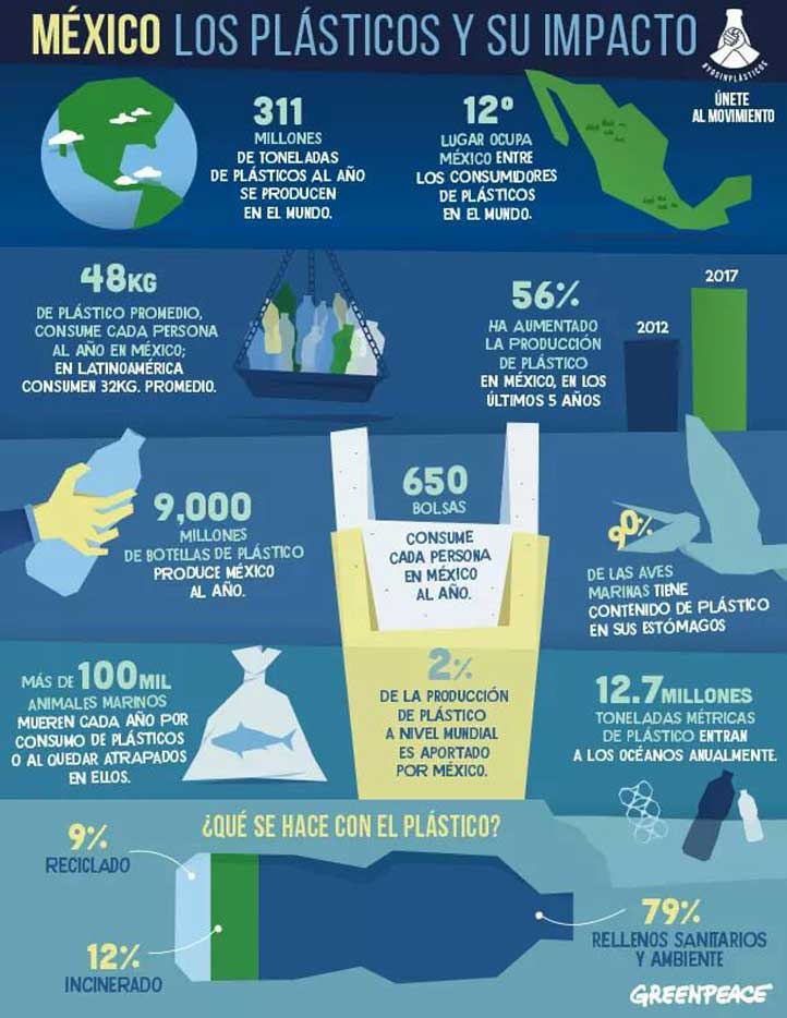 De acuerdo con cifras proporcionadas por Greenpeace, cada año se producen 311 millones de toneladas de plástico a nivel mundial; 12.7 millones de toneladas métricas de plástico entran a los océanos anualmente.