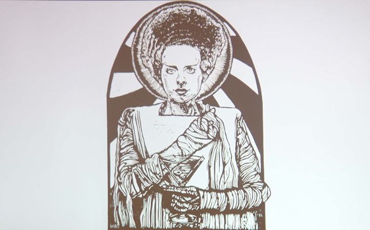 Carlos Flores explicó que su trabajo parte del interés por representar elementos de la cultura urbana y popular mexicana –como la lucha libre, los cómics, la música cumbia, los rótulos y la religiosidad popular–, los cuales combinan referencias del arte clásico y el grabado tradicional.