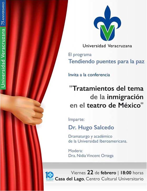 21/02/19, Xalapa, Ver.- En el marco del programa “Tendiendo puentes por la paz” de la Universidad Veracruzana (UV), el dramaturgo jalisciense Hugo Salcedo impartirá la conferencia “Tratamientos del tema de la inmigración en el teatro de México”, el viernes 22 de febrero a las 18:00 horas en la Casa del Lago. La entrada es libre.