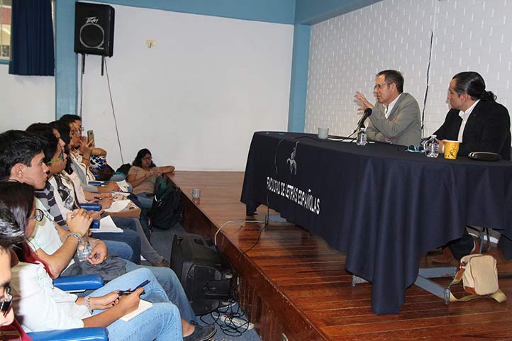 Al inicio de su participación, Barrios Lara fue recibido por Magali Velasco Vargas, directora de la Facultad de Letras Españolas, y por Germán Ceballos Gutiérrez, académico de la UV.