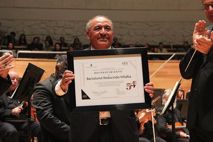 Previo al inicio del concierto, a nombre de los integrantes de la OSX se entregó un reconocimiento a Bartolomé Reducindo Villalba por su responsabilidad, compromiso y entrega a lo largo de 54 años dedicados al montaje y acondicionamiento del escenario de la orquesta.