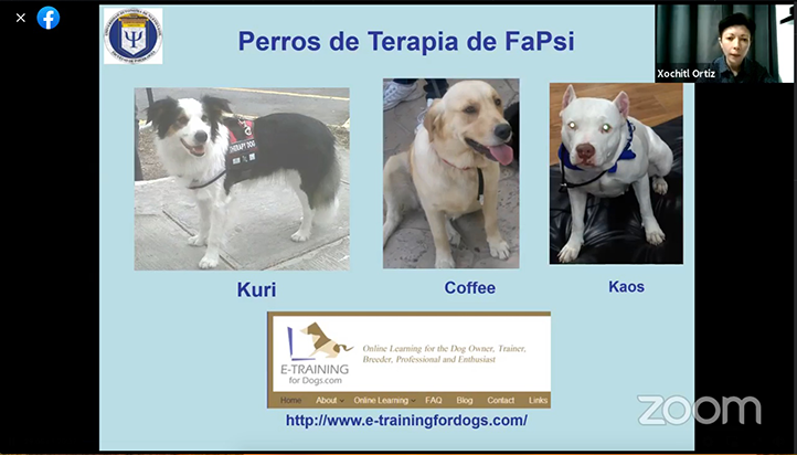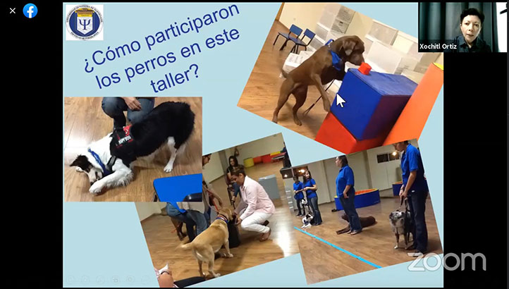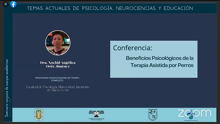 Con la conferencia “Beneficios psicológicos de la TEA por perros”, la académica participó en el Seminario Conjunto de Cuerpos Académicos “Temas actuales de psicología, neurociencias y educación”, donde colabora la Universidad Veracruzana (UV) a través del cuerpo académico (CA) Psicología, Desarrollo, Salud y Educación, adscrito a la Facultad de Psicología.