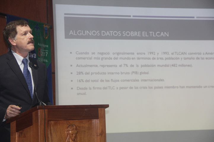 Ante alumnos de la entidad universitaria, el también ex director general del Consejo Nacional de Ciencia y Tecnología (Conacyt) abordó los reales alcances del TLCAN, su contexto, su contenido y sus horizontes de prospectiva.