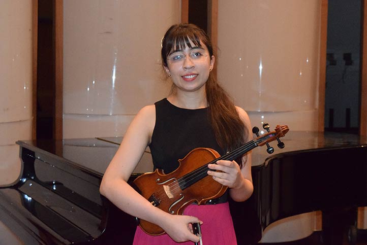 “Al tocar el violín puedo canalizar mis sentimientos y refugiarme en lo que este instrumento me brinda”, expresó la joven tras presentar su examen de titulación el 19 junio en el auditorio de la Facultad de Música de la UV.