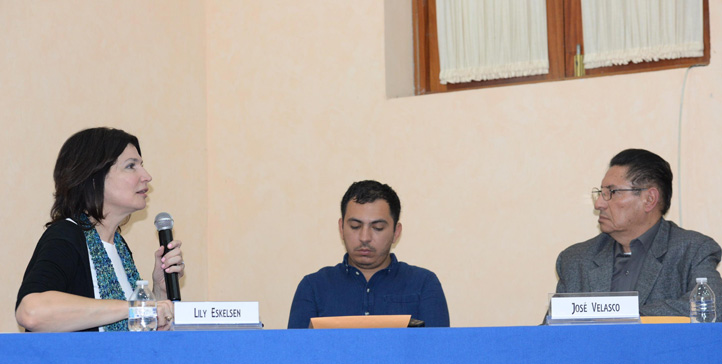 La ponente conversó con el investigador José Velasco Toro, acompañados del periodista Luis Chaparro, quien fungió como traductor