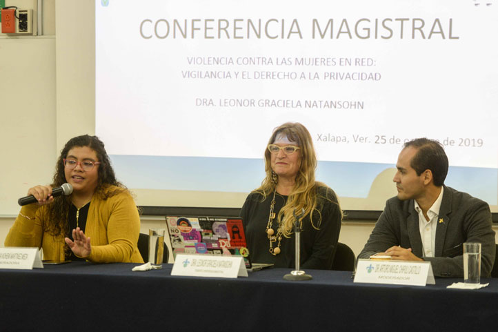 Periodista con Doctorado en Comunicación y Cultura Contemporánea, la investigadora estuvo el viernes 24 de octubre en el Instituto de Investigaciones Jurídicas (IIJ) de la Universidad Veracruzana (UV), en donde a invitación del cuerpo académico (CA) Derecho, Gobierno y Multidisciplinariedad Jurídica ofreció la conferencia magistral “Violencia contra las mujeres en la red: vigilancia y el derecho a la privacidad”.