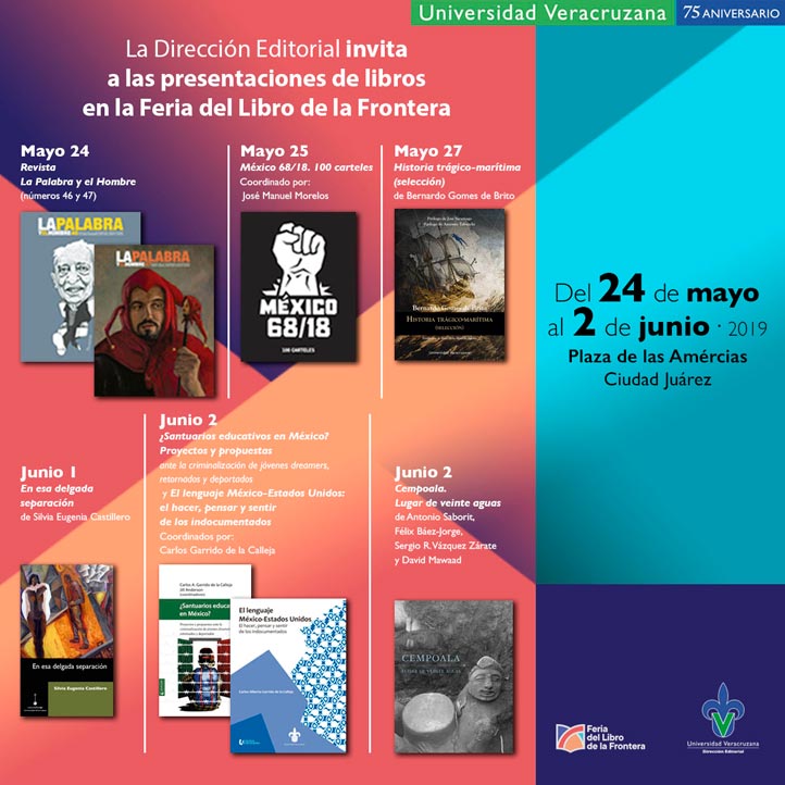 24/05/2019, Xalapa, Ver.- La Universidad Veracruzana (UV) es la invitada de honor en la Feria del Libro de la Frontera, que se realiza del 24 de mayo al 2 de junio en Plaza de las Américas en Ciudad Juárez, Chihuahua, donde la Editorial universitaria tendrá en exhibición y venta sus publicaciones más recientes y realizará seis presentaciones de libros y revistas.