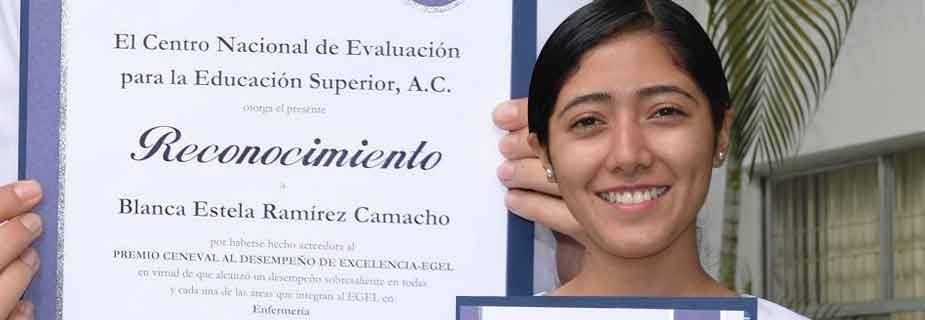 Alma Celia San Martín, Poza Rica, Ver.- Blanca Estela Ramírez Camacho, egresada de la Licenciatura en Enfermería de la Universidad Veracruzana (UV), recibió el Premio al Desempeño de Excelencia en el Examen General para el Egreso de la Licenciatura (EGEL) que otorga el Centro Nacional para la Evaluación de la Educación Superior (Ceneval) a los estudiantes sobresalientes.