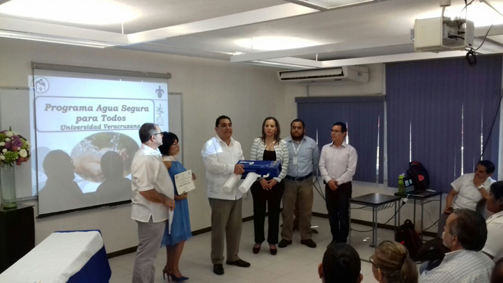 Poza Rica, Ver., 18/04/2017.- José Luis Alanís Méndez, vicerrector de la región Poza Rica-Tuxpan de la Universidad Veracruzana (UV), recibió de manos de Eric Pascal Houbron, coordinador de Protección al Medio Ambiente de esta casa de estudio, la purificadora de agua semilla donada por el Club Rotario Córdoba, misma que se instalará en la Facultad de Ciencias Químicas (FCQ).
