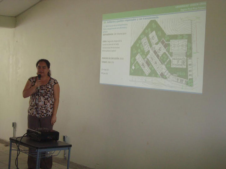 Mariana Abril González Cervantes, coordinadora de Proyectos, Construcciones y Mantenimiento en la región Poza Rica-Tuxpan, informó sobre la reactivación de la primera etapa de construcción de las instalaciones de la UVI Totonacapan, como un ejercicio de socializar información relativa a la ejecución de una obra de infraestructura educativa que estaba pendiente de realizar en la sede.