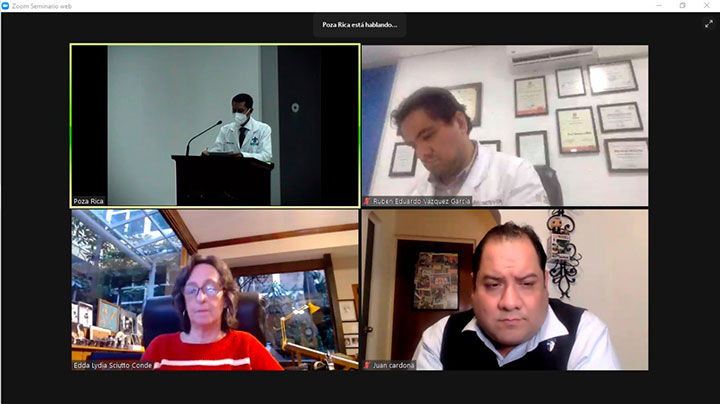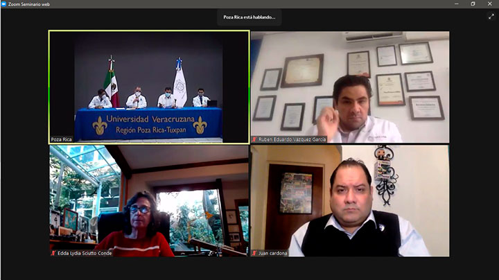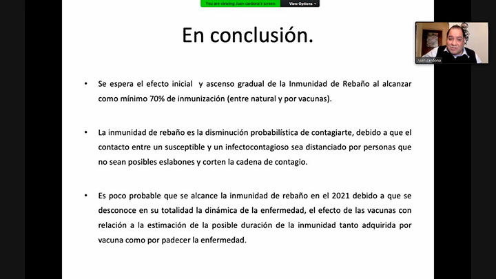 Rubén Eduardo Vázquez García, director del Hospital Regional de Poza Rica y académico de la Facultad de Medicina, disertó acerca de los mecanismos inmunológicos que provoca la infección por el virus SARS-CoV-2 en el organismo humanoresaltó los puntos clave de cómo se da una respuesta inmunológica correcta ante el virus en el 80 por ciento de las personas, y cómo en algunos individuos susceptibles esta reacción es deficiente y lleva al agravamiento de la enfermedad.