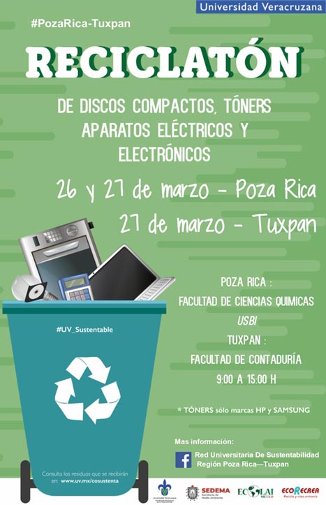 24/03/19, Poza Rica, Ver.- La Coordinación Universitaria para la Sustentabilidad (CoSustenta) de la Universidad Veracruzana (UV) llevará a cabo el Reciclatón 2019, los días 26 y 27 de marzo de 9:00 a 15:00 horas, en la Unidad de Servicios Bibliotecarios y de Información (USBI) y en la Facultad de Ciencias Químicas (FCQ).