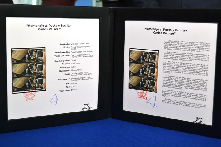 Mencionó que la estampilla fue diseñada por Vivek Luis Martínez Avín, quien usó la técnica de fotografía y composición digital. Además, detalló: “El acervo cultural pertenece a la Casa Museo ‘Carlos Pellicer’ que se encuentra en Villahermosa, Tabasco, y las tintas que se utilizaron son cian, magenta, amarillo, negro y tinta de seguridad.