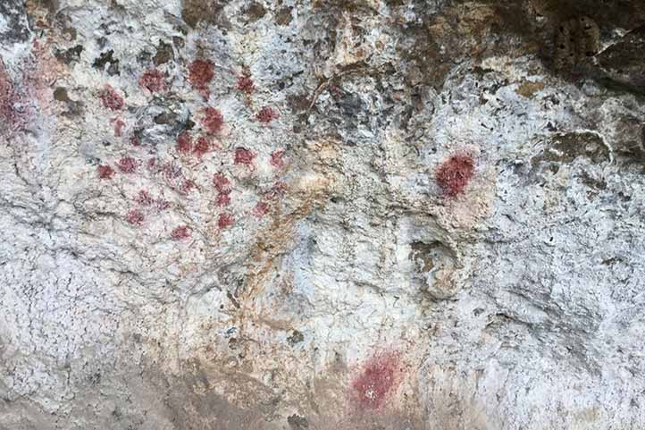 Las manchas fueron plasmadas con mineral, probablemente almagre (óxido rojo de hierro) y se aprecian en todo el abrigo rocoso; pero es en el extremo de mayor altura, al filo de la barranca, donde más se concentran.