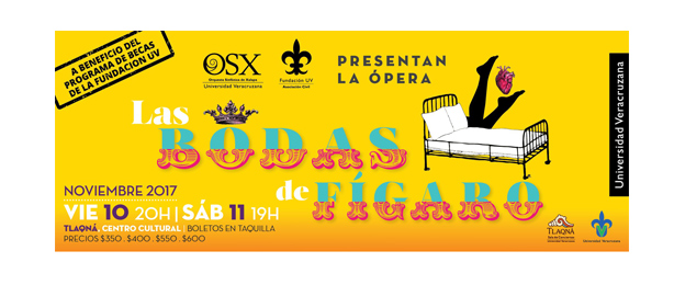Karina de la Paz Reyes.- La Orquesta Sinfónica de Xalapa (OSX) de la Universidad Veracruzana (UV) presentará la ópera Las bodas de Fígaro, de Wolfgang A. Mozart, el viernes 10 y el sábado 11 de noviembre en Tlaqná, Centro Cultural, a beneficio del programa de becas de la Fundación UV.