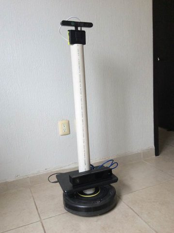 El investigador detalló que el robot aspiradora es de baja altura y se necesitaba ubicarlo al nivel de las personas, por ello para cambiar esta situación se llegó a una solución sencilla. La estructura está soportada sobre tubos de PVC de tres pulgadas que tenía en casa; sobre ellos montamos el dispositivo y le colocamos las cámaras, así logramos un robot de un 1.20 metros de altura, no uno de 15 centímetros de altura”, dijo.