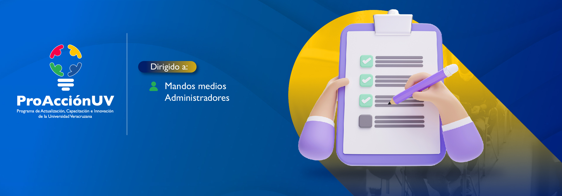 La y el participante adquiere las habilidades directivas básicas, a través de estudios de casos, ejercicios de pensamientos proactivos y de la metodología de liderazgo situacional dentro de los entornos laborales, a fin de dirigir el trabajo de las y los colaboradores universitarios, el cual da cumplimiento a metas y responsabilidades institucionales, marcadas en el Programa de Trabajo 2021-2025 de la Universidad Veracruzana.