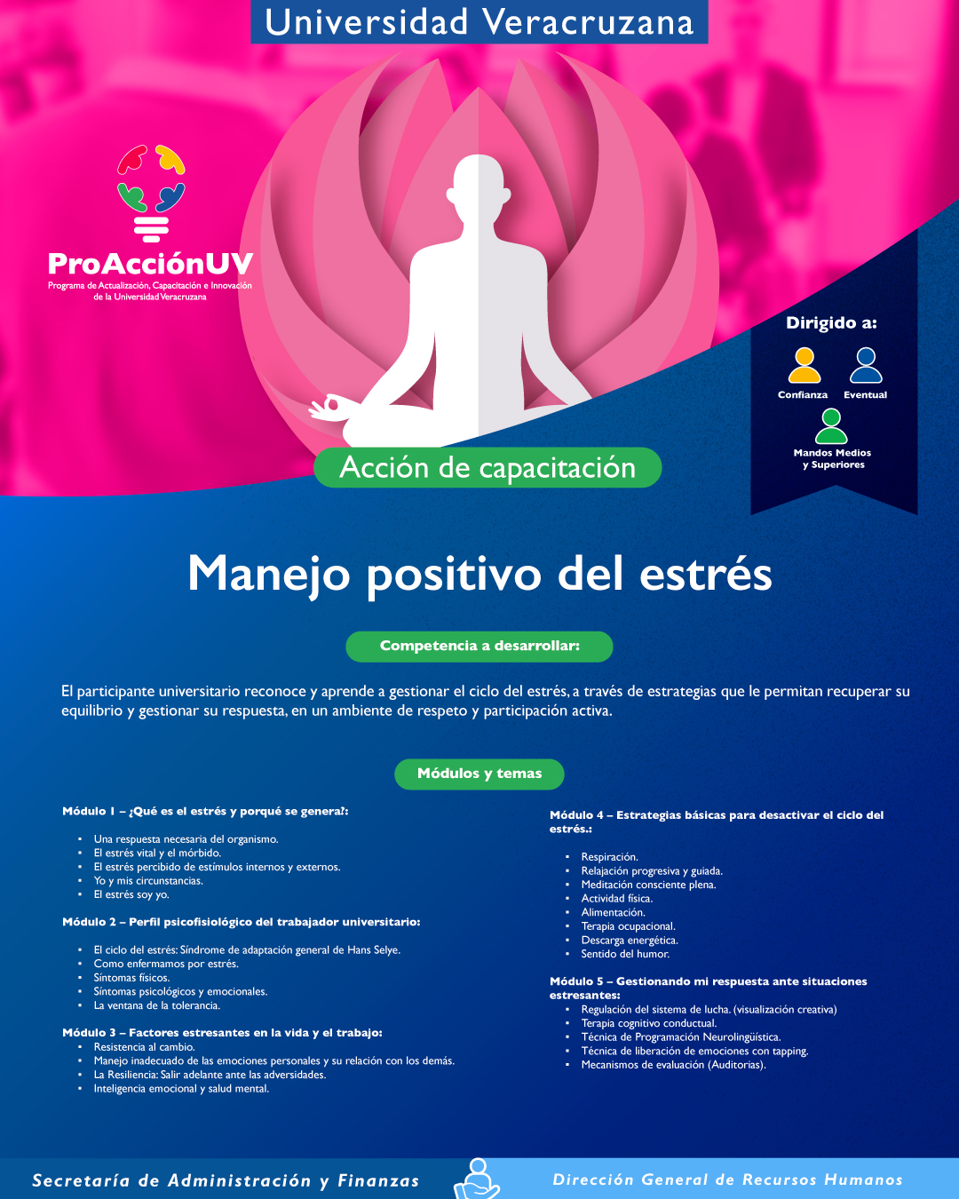 El participante universitario reconoce y aprende a gestionar el ciclo del estrés, a través de estrategias que le permitan recuperar su equilibrio y gestionar su respuesta, en un ambiente de respeto y participación activa.