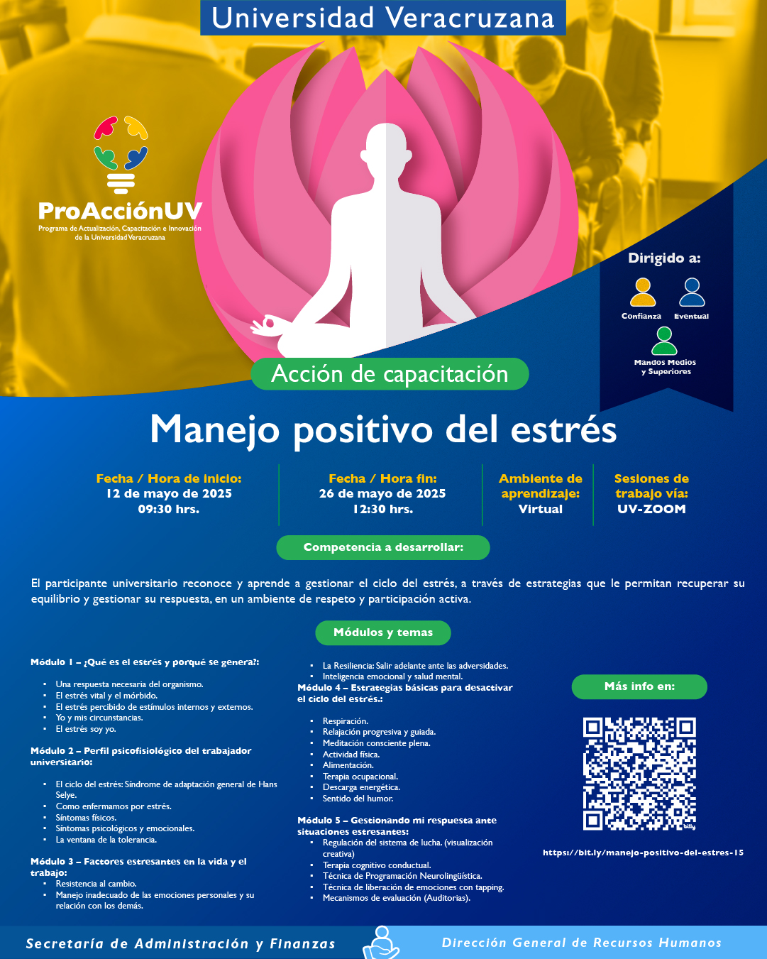 El participante universitario reconoce y aprende a gestionar el ciclo del estrés, a través de estrategias que le permitan recuperar su equilibrio y gestionar su respuesta, en un ambiente de respeto y participación activa.