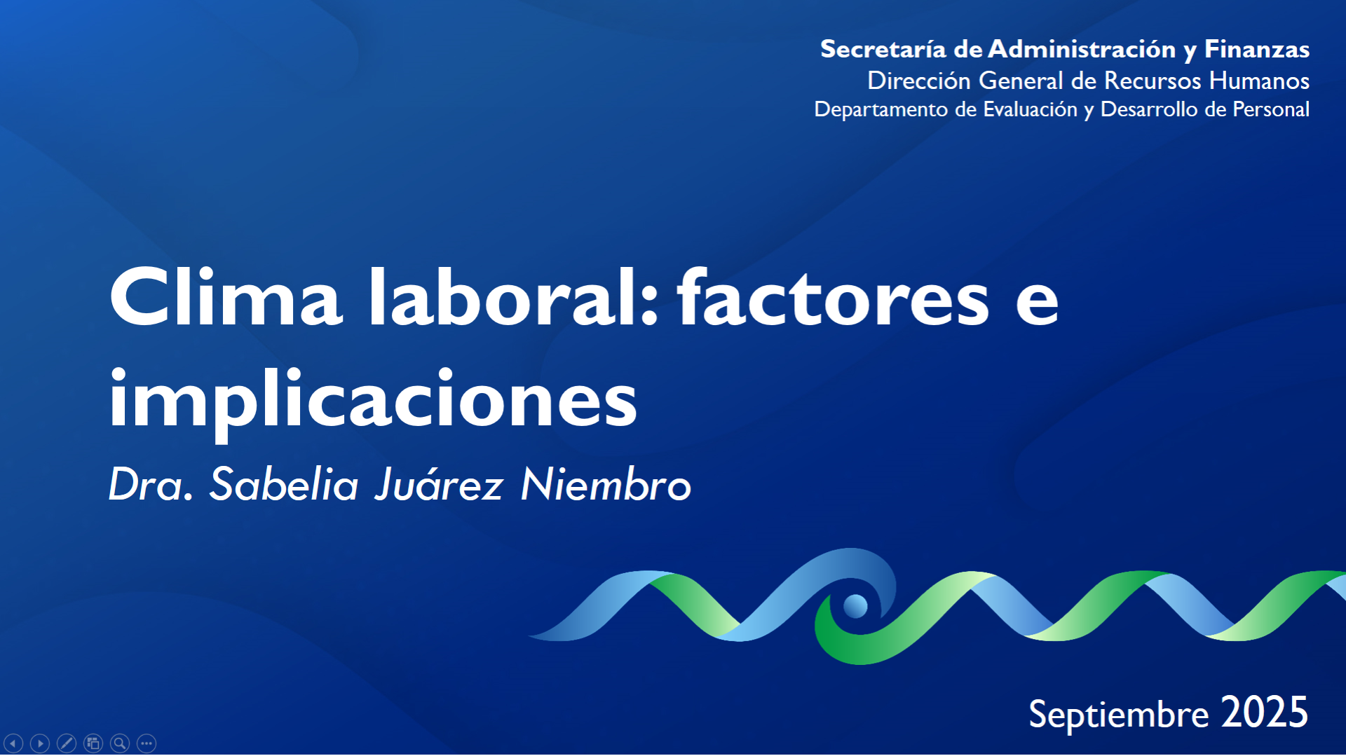 Jornada de capacitación para toda la Dirección General de Difusión Cultural, que se llevó a cabo los días 02, 03, 04, 05 y 09 de septiembre en modalidad presencial (cada fecha es de un grupo diferente), el curso se llamó: Clima laboral: factores e implicaciones y fue impartido por la Dra. Sabelia Juárez Niembro.