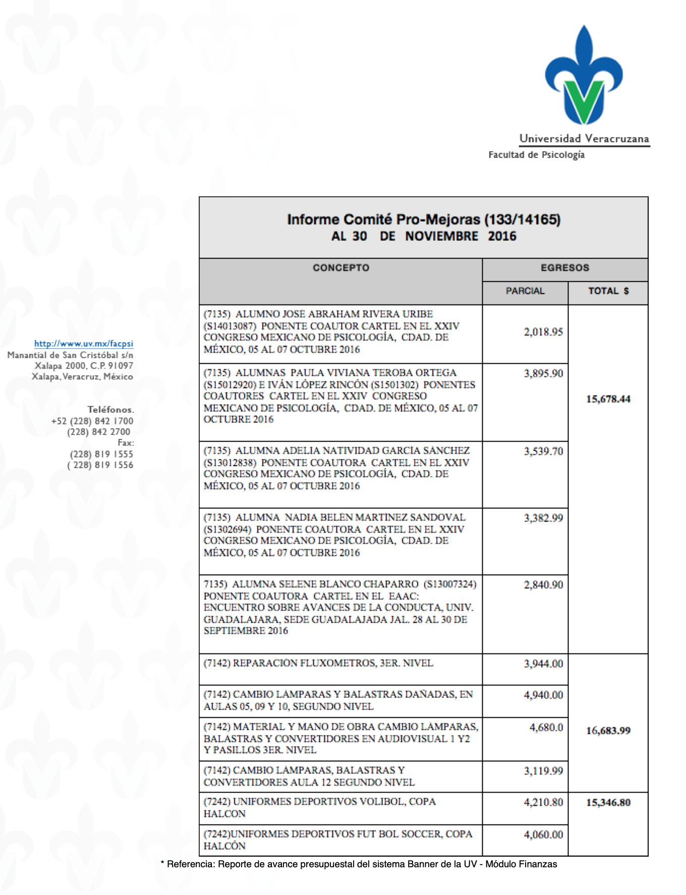 En apego al artículo 16 del Reglamento de Ingresos y Egresos, así como del artículo 13 de la Ley Orgánica de la Universidad Veracruzana, en donde se definen los ingresos y el patrimonio de nuestra institución, y en concordancia con la obligación de rendición de cuentas, transparencia y uso correcto de los recursos públicos a que estamos obligados los titulares de entidades de nuestra Universidad Veracruzana, informo a ustedes sobre la aplicación que tuvieron sus aportaciones a partir del inicio de esta Administración en el 2012.