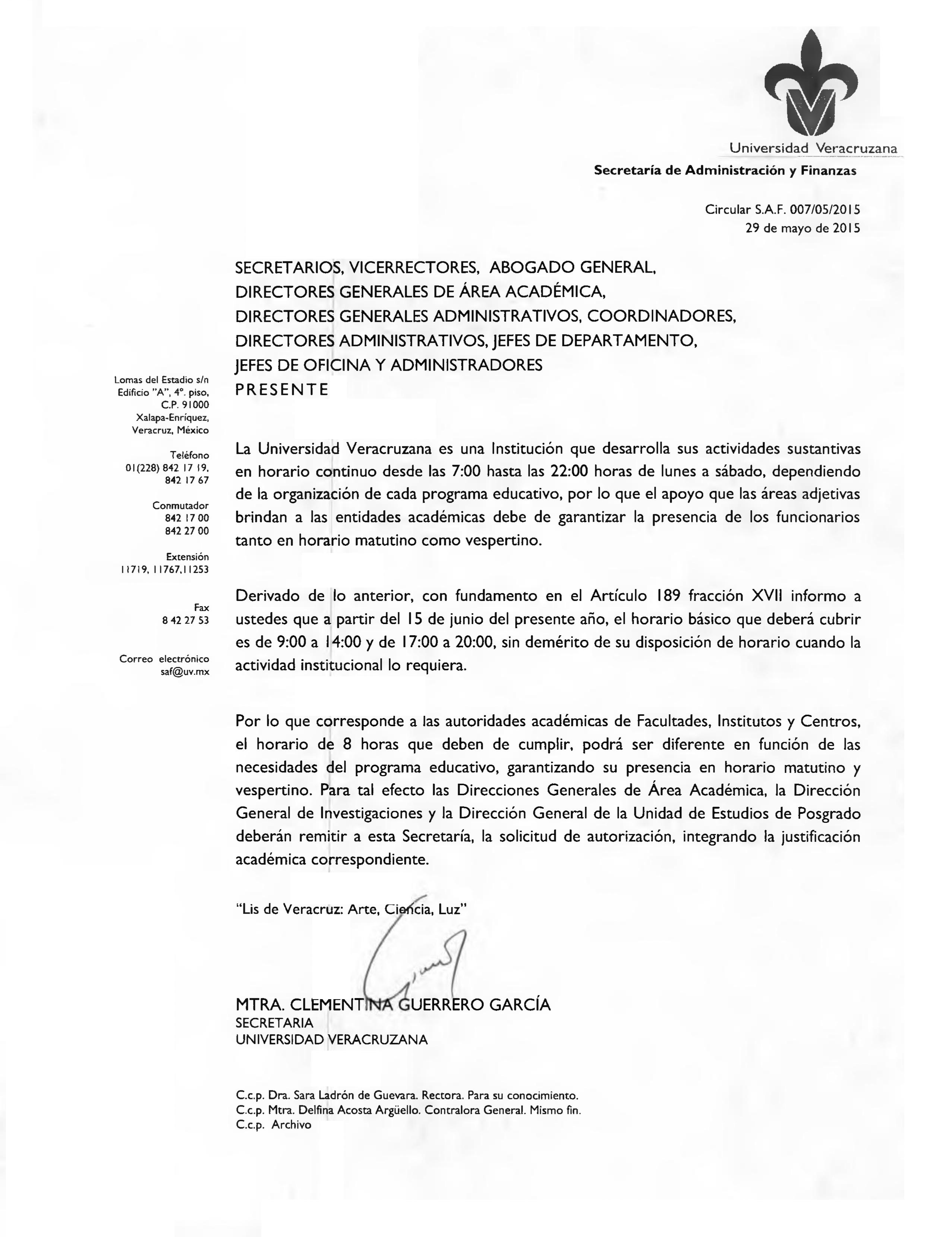 Circular SAF 007/05/20015 Cumplimiento del horario básico de labores para Funcionarios, Autoridades Académicas y Administrativas