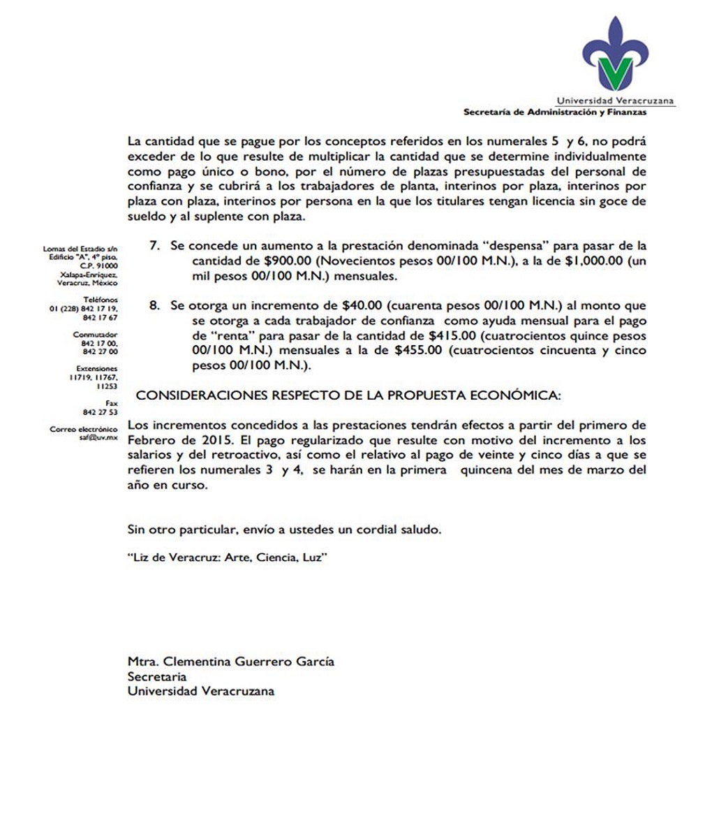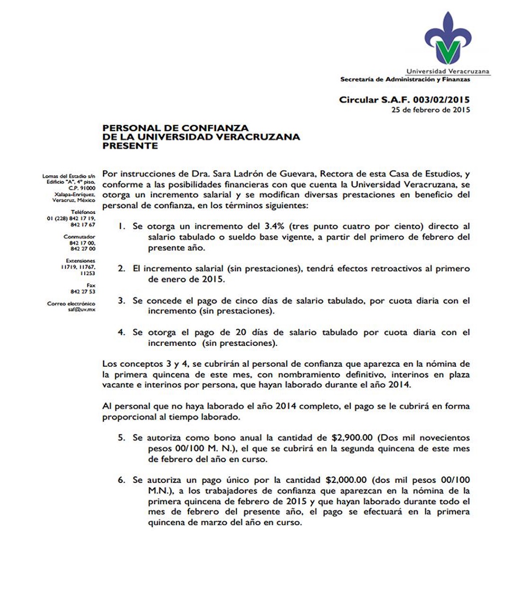 Circular SAF 003/02/2015 > Incremento salarial y modificación de prestaciones al Personal de Confianza de la Universidad Veracruzana