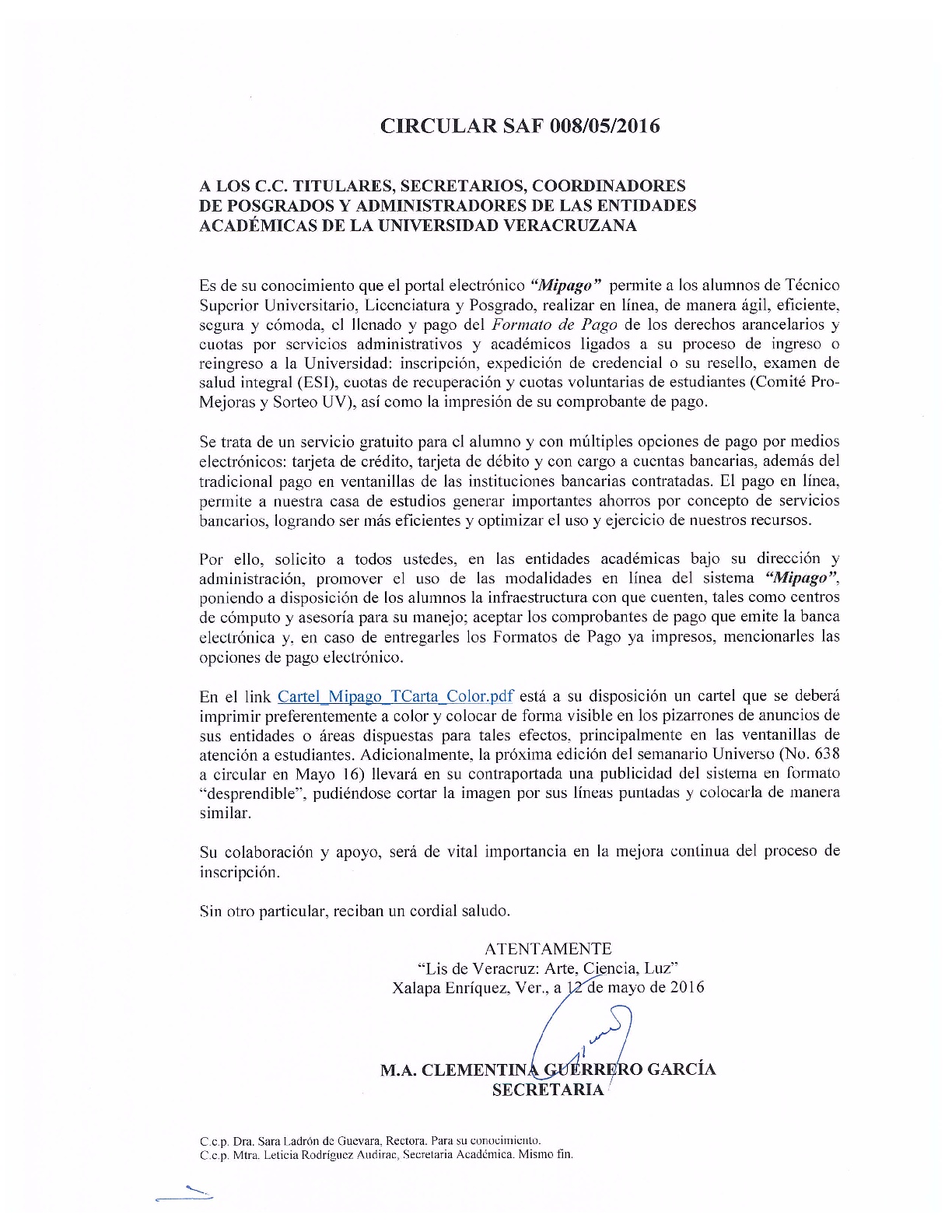 A los Titulares, Secretarios, Coordinadores de Posgrados y Administradores de las Entidades Académicas de la Universidad Veracruzana .