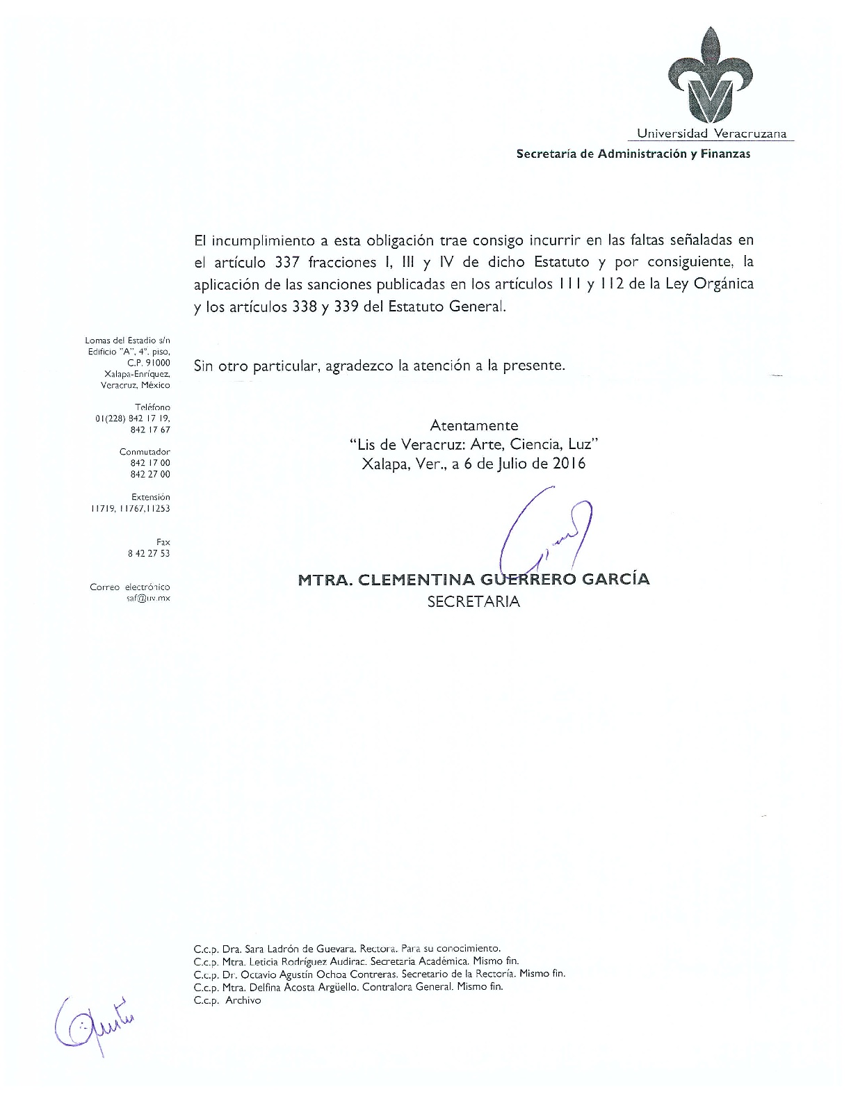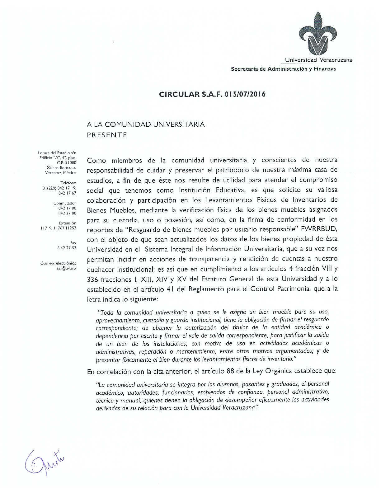 Circular SAF 015/07/2016 A la comunidad Universitaria Levantamiento Físico del Inventario de Bienes Muebles mediante la verificación física de los bienes muebles asignados para la custodia, uso o posesión. . .