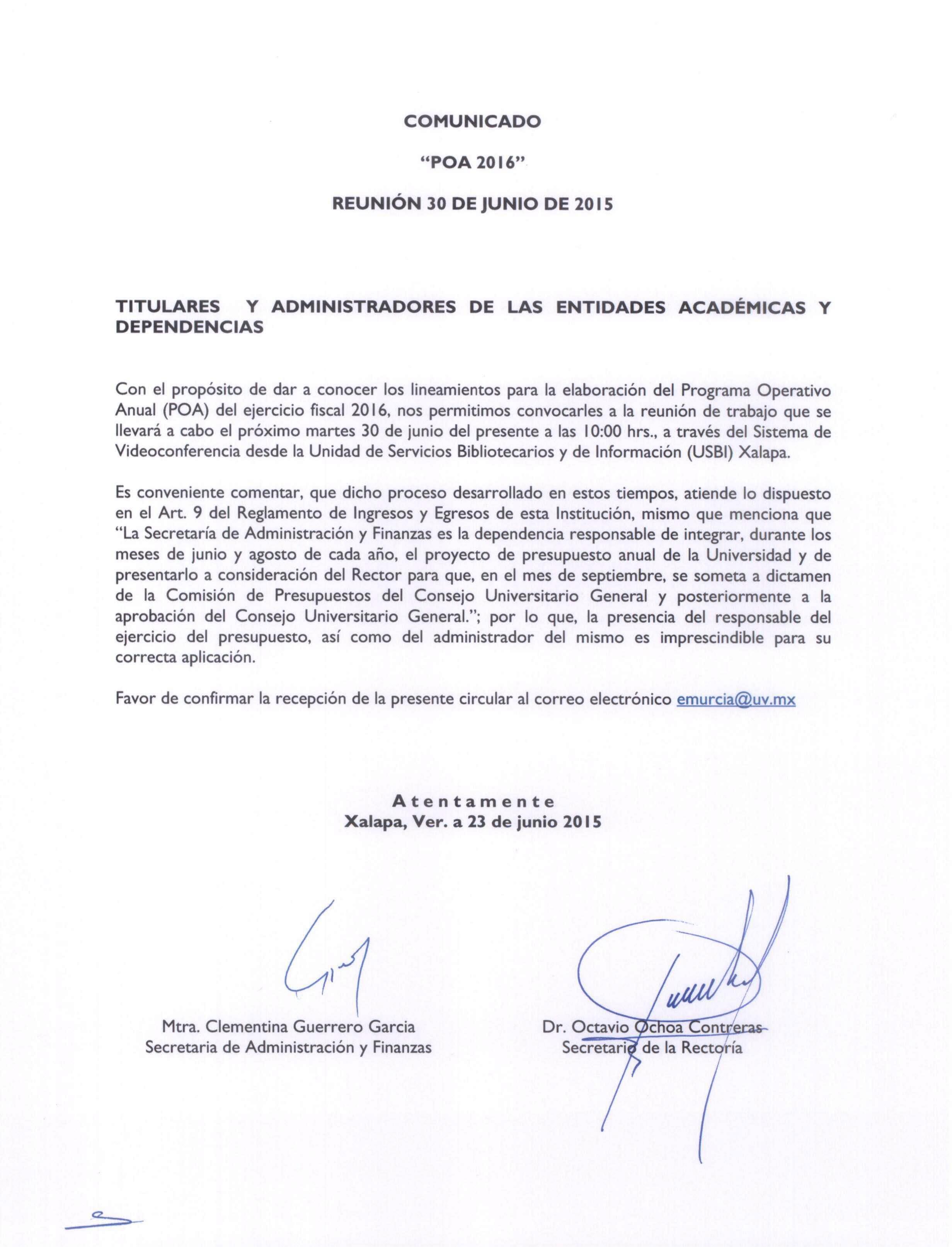 Reunión de Trabajo para dar a conocer los lineamientos para la elaboración del Programa Operativo Anual (POA) del ejercicio fiscal 2016. Martes 30 de junio de 2015.