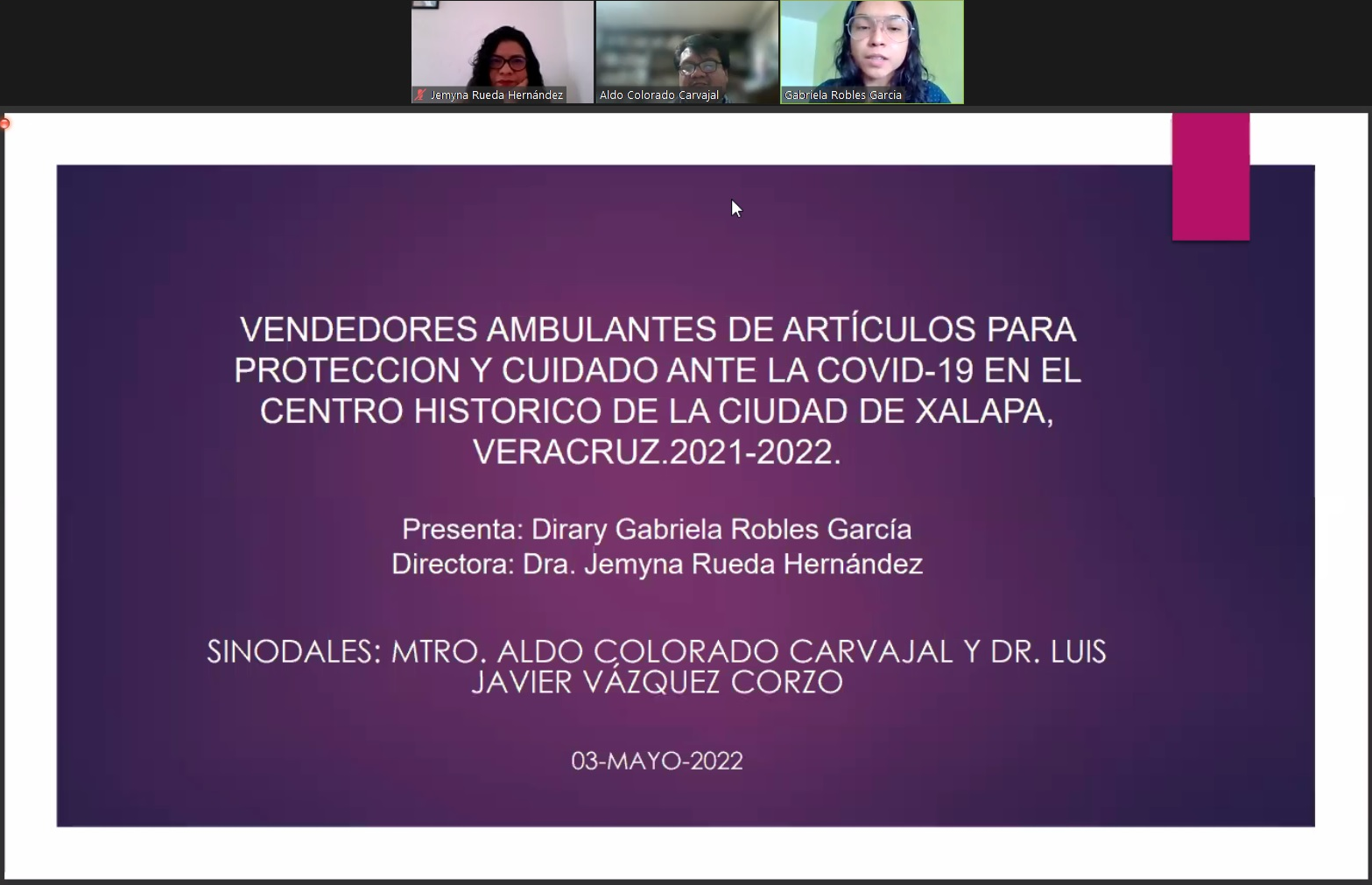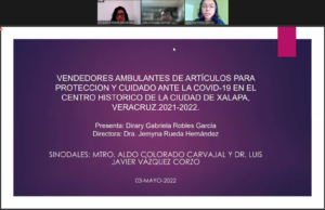 La Facultad de Sociología felicita a Dirary Gabriela Robles García de la generación 2018-2022, por haber presentado el día 03 de mayo de 2022 su examen de titulación, en la modalidad de Tesis, con el título: Vendedores ambulantes de artículos para protección y cuidado ante la COVID-19 en el centro histórico de la ciudad de Xalapa, Veracruz. 2021-2022. El jurado estuvo integrado por: Presidenta, Dra. Jemyna Rueda Hernández; Secretario, Mtro. Aldo Colorado Carvajal; Vocal, Dr. Luis Javier Vázquez Corzo.