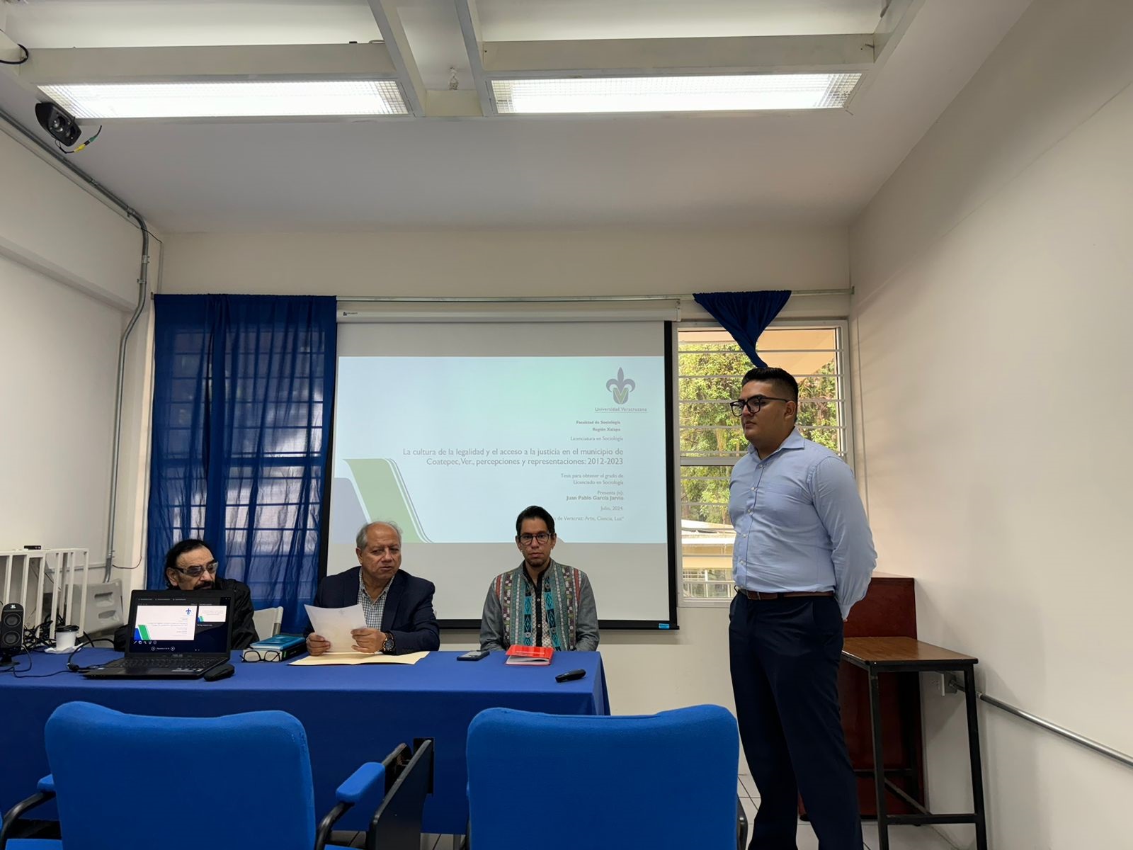 La Facultad de Sociología felicita a Juan Pablo García Jarvio de la generación 2017, por haber presentado el día 10 de julio de 2024 su examen de titulación en modalidad de Tesis, titulado; «La cultura de la legalidad y el acceso a la justicia en el municipio de Coatepec, Ver., percepciones y representaciones: 2012-2023», llevado a cabo en la sala audiovisual el “Che” de la Facultad de Sociología. El jurado estuvo integrado por: Presidente, Dr. Víctor Manuel Andrade Guevara; Secretario, Dr. Luis Javier Vásquez Corzo; Vocal, Mtro. José Carlos López Hernández.