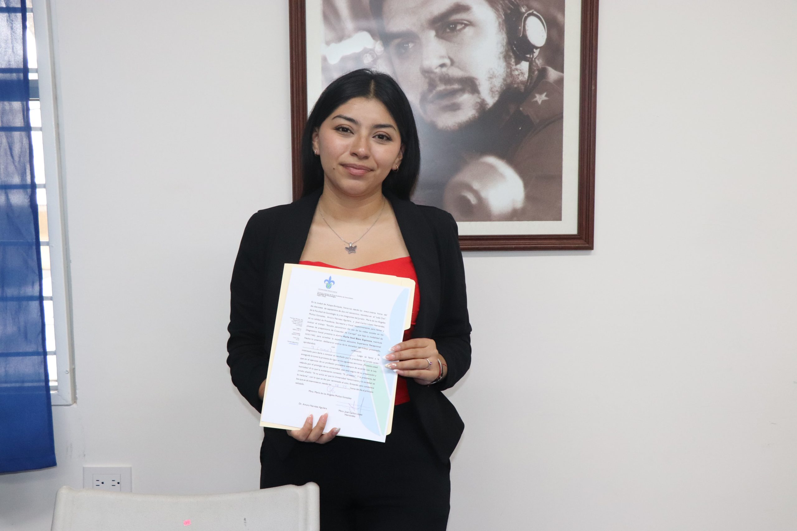 La Facultad de Sociología felicita a Karla Itzel Báez Espinoza, por haber presentado el día 17 de septiembre de 2025 su examen de titulación en modalidad de Diagnóstico Social, titulado «Estudio panorámico del uso de las redes sociales en los jóvenes de preparatoria de Cosautlan de Carvajal», presentado en la Sala Audiovisual el “Che” de la Facultad de Sociología. El jurado estuvo integrado por: Presidenta, Mtra. María de los Ángeles Muñoz González; Secretario, Mtro. Arturo Narváez Aguilera; Vocal, Mtro. José Carlos López Hernández.