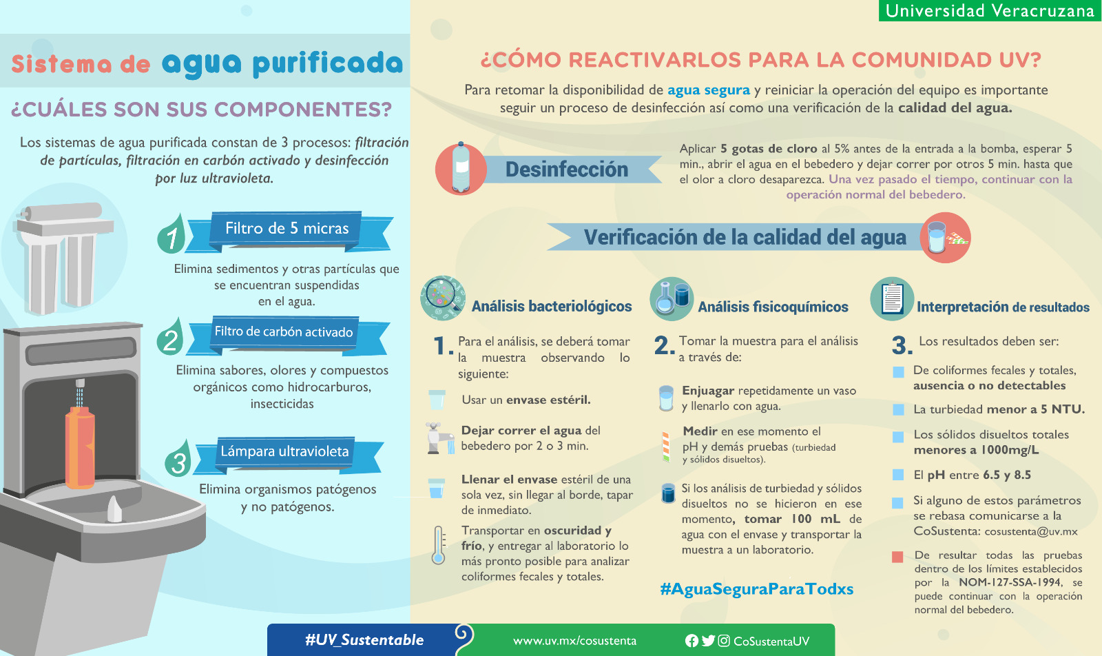 Bajo un enfoque de sustentabilidad, la Universidad Veracruzana fomenta el cuidado del agua en todas las entidades de sus distintas regiones, remarcando la importancia de su uso sensato en la comunidad universitaria y la población en general, así como brindando agua segura para beber de modo gratuito.