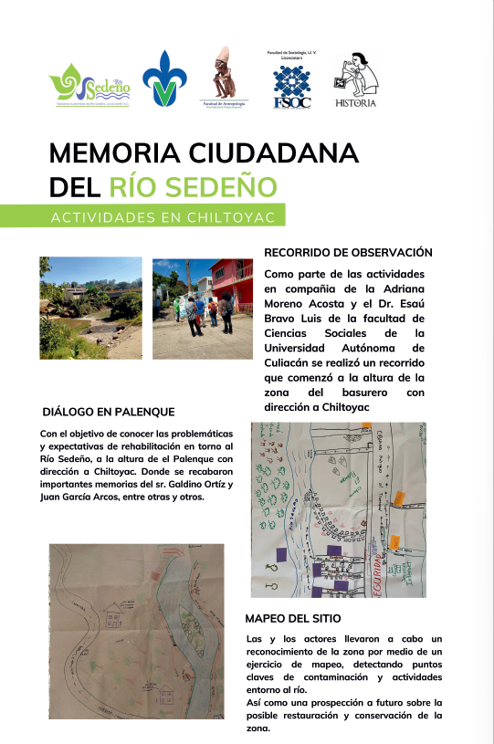 Título del proyecto: Memoria Ciudadana del Río Sedeño Entidad Académica: Facultad de Antropología Año: 2023 Resumen: «Memoria Ciudadana del Río Sedeño. Elementos para la sostenibilidad de comunidades urbanas”, realizado por docentes y estudiantes de la Facultad de Antropología de mayo a diciembre de 2023. El propósito fue reconocer contextos en las localidades de la colonia El Palenque y el ejido de Chiltoyac, en Xalapa Veracruz, a través de la etnografía, en donde fuera viable replicar las experiencias de la A.C. Desarrollo Sustentable del Río Sedeño (DSRS), relacionadas a la agroecología y participación ciudadana. Las nociones de ciudadanía y memoria, a través del enfoque de microhistoria, permitieron distinguir los contextos y prácticas que favorecen o inhiben, la participación ciudadana en escenarios sociales que involucran la gestión, saneamiento del agua, y la apropiación del territorio. |