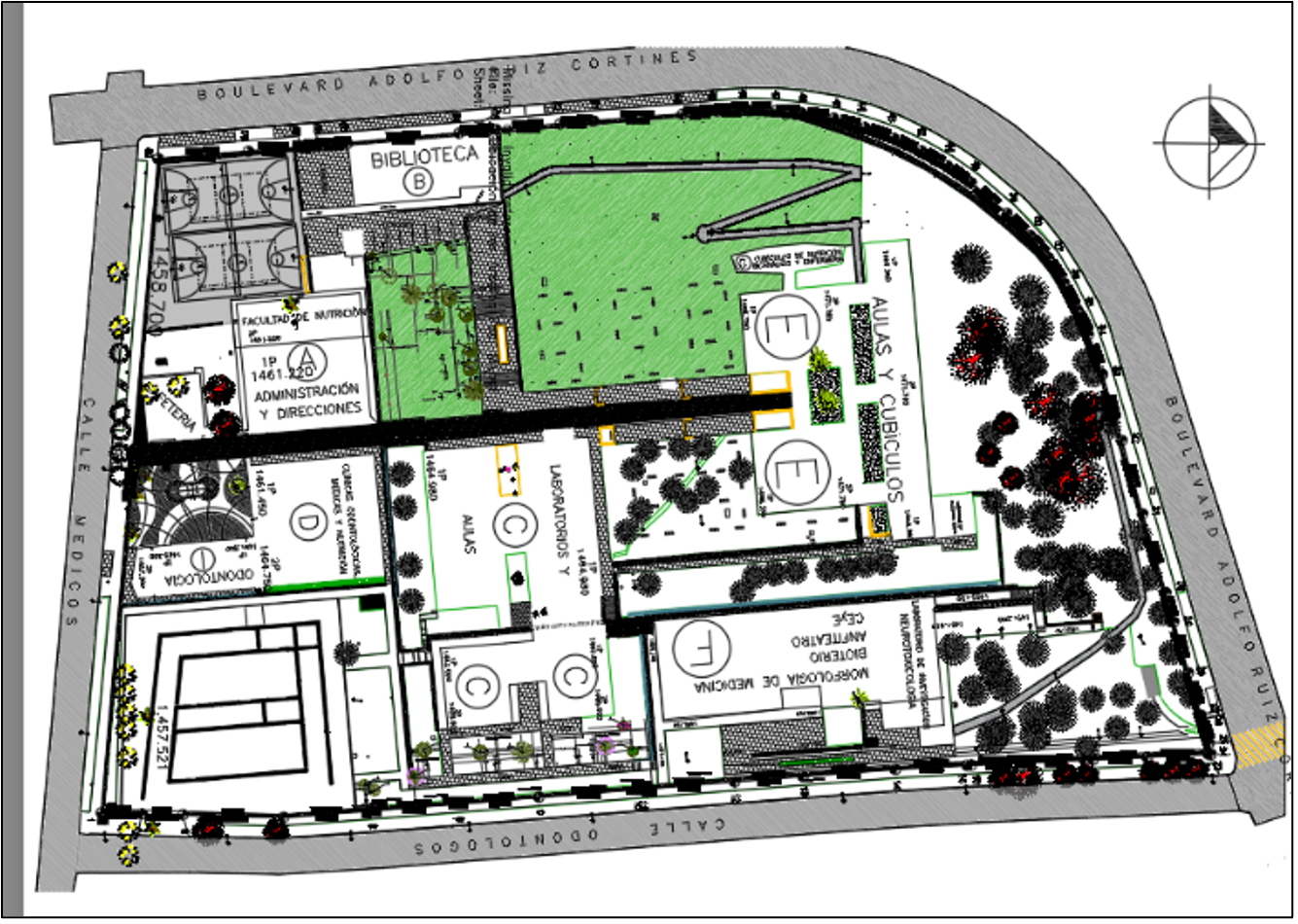 El área de intervención para las acciones de REPE son las colindantes con la la reja perimetral con la Av. Ruiz Cortines al oeste, con el pasillo principal al este y con el edificio A de la Unidad al sur.