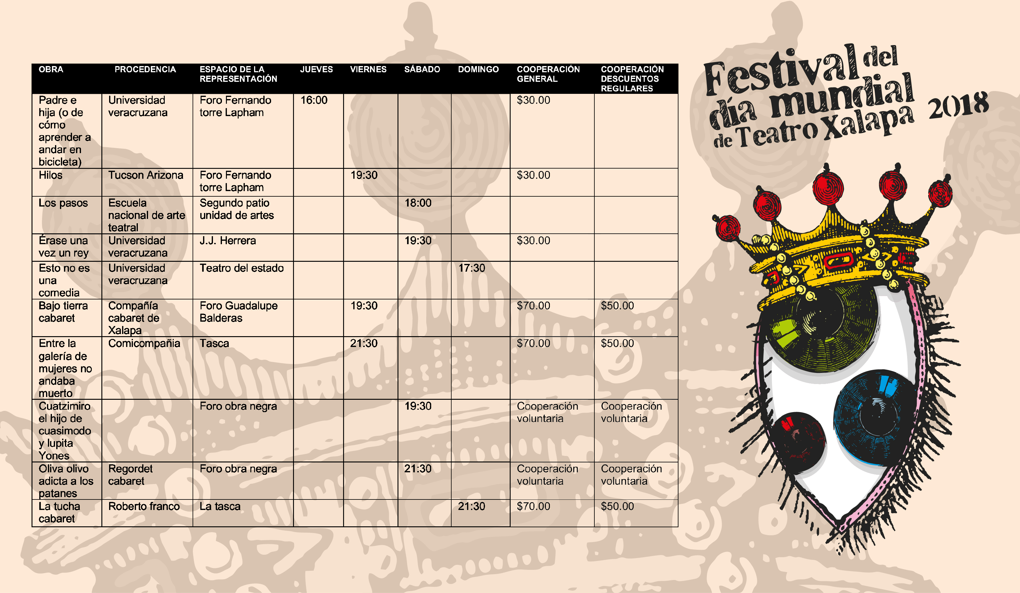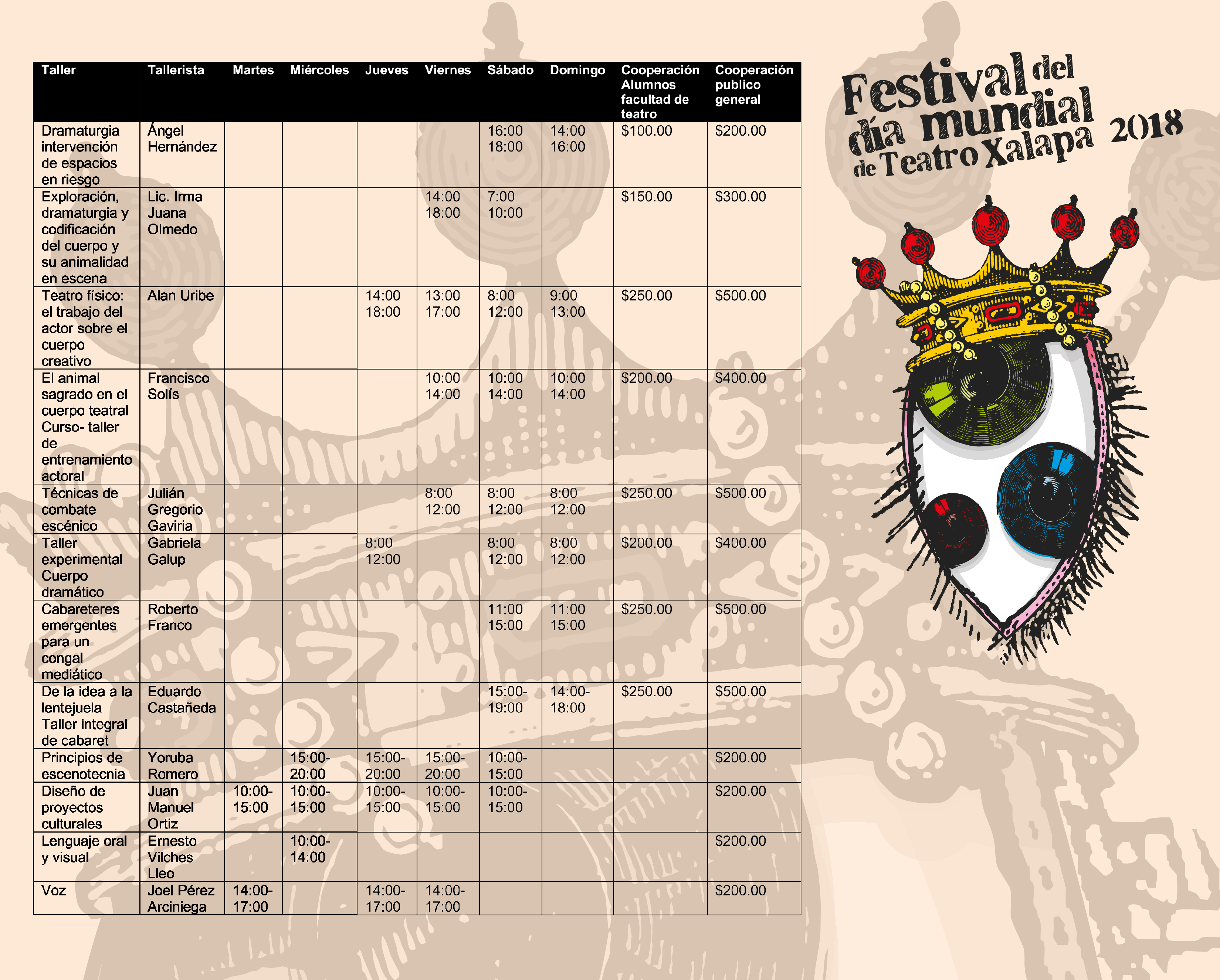 Estimados alumnos, egresados, profesores y público en general, la Facultad de Teatro tiene el honor de invitarlos a las actividades del Festival del Día Mundial del Teatro Xalapa 2018. Aquí el programa: