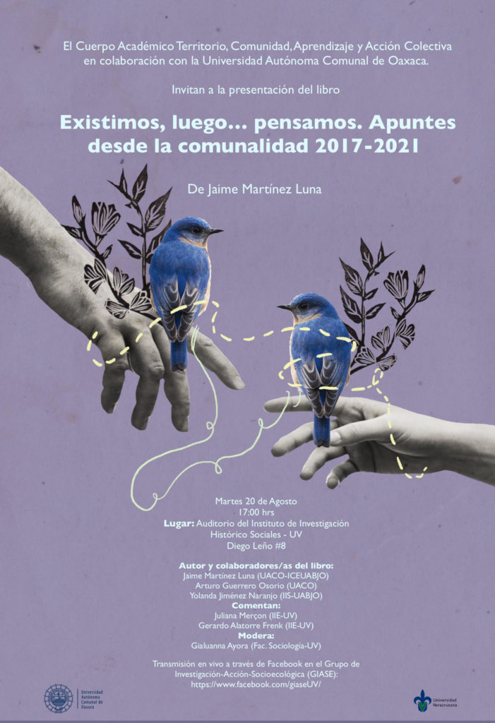 El Cuerpo Académico Territorio, Comunidad, Aprendizaje y Acción Colectiva de la Universidad Veracruzana, en colaboración con la Universidad Autónoma Comunal de Oaxaca (UACO), invita a la presentación del libro Existimos, luego… pensamos: apuntes desde la comunalidad 2017-2021 del Mtro. Jaime Martínez Luna, el 20 de agosto de 2024 de 17 a 18:30 hrs., en el Auditorio del Instituto de Investigaciones Histórico-Sociales, Universidad Veracruzana, Diego Leño 8, Xalapa centro, Veracruz.