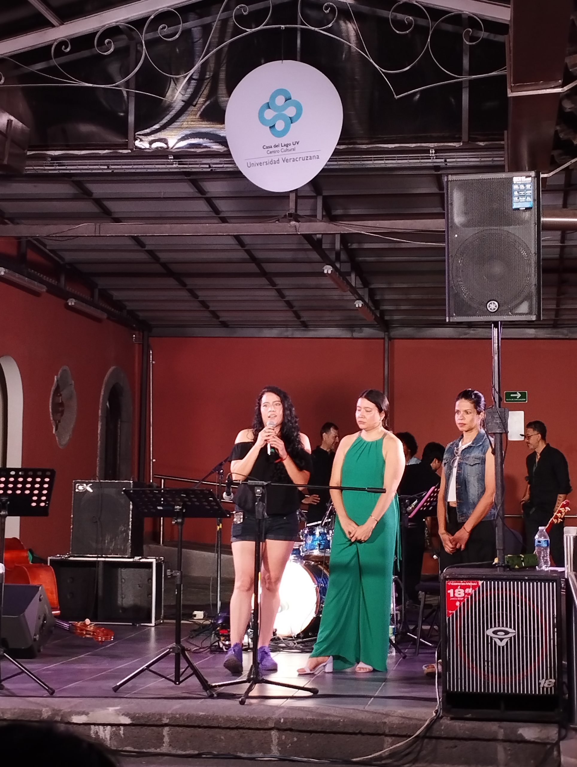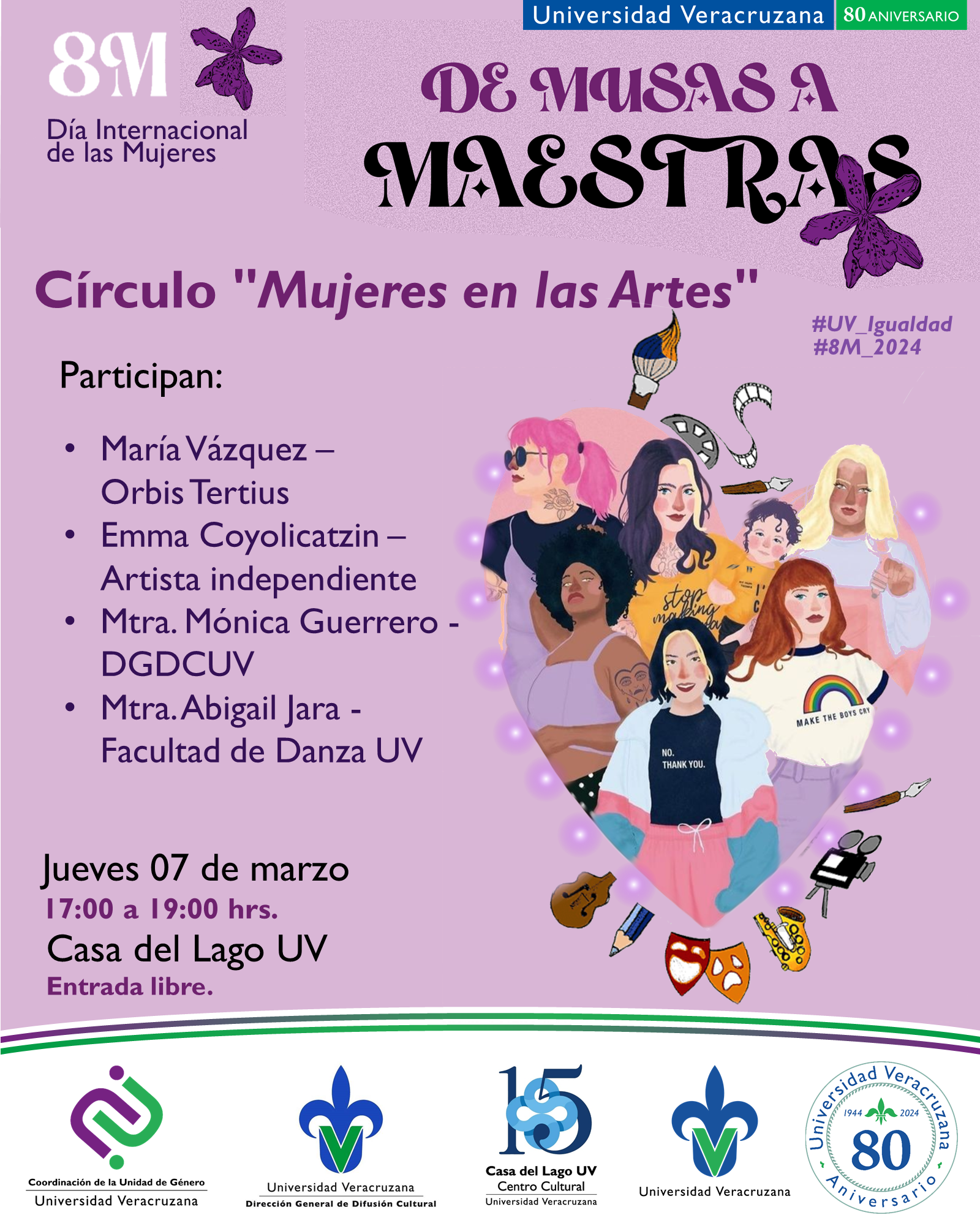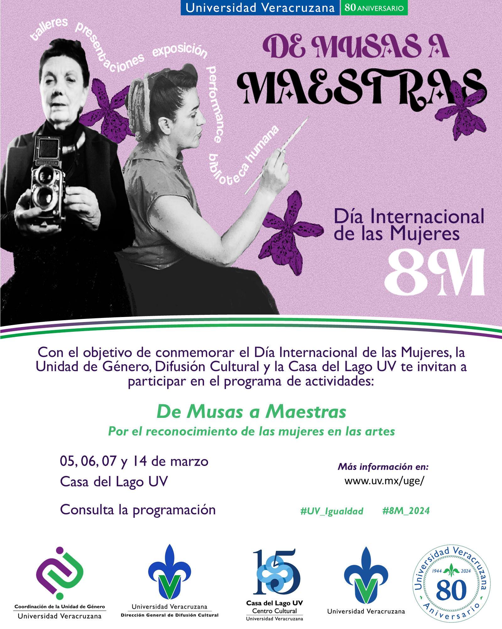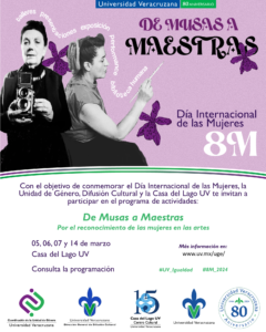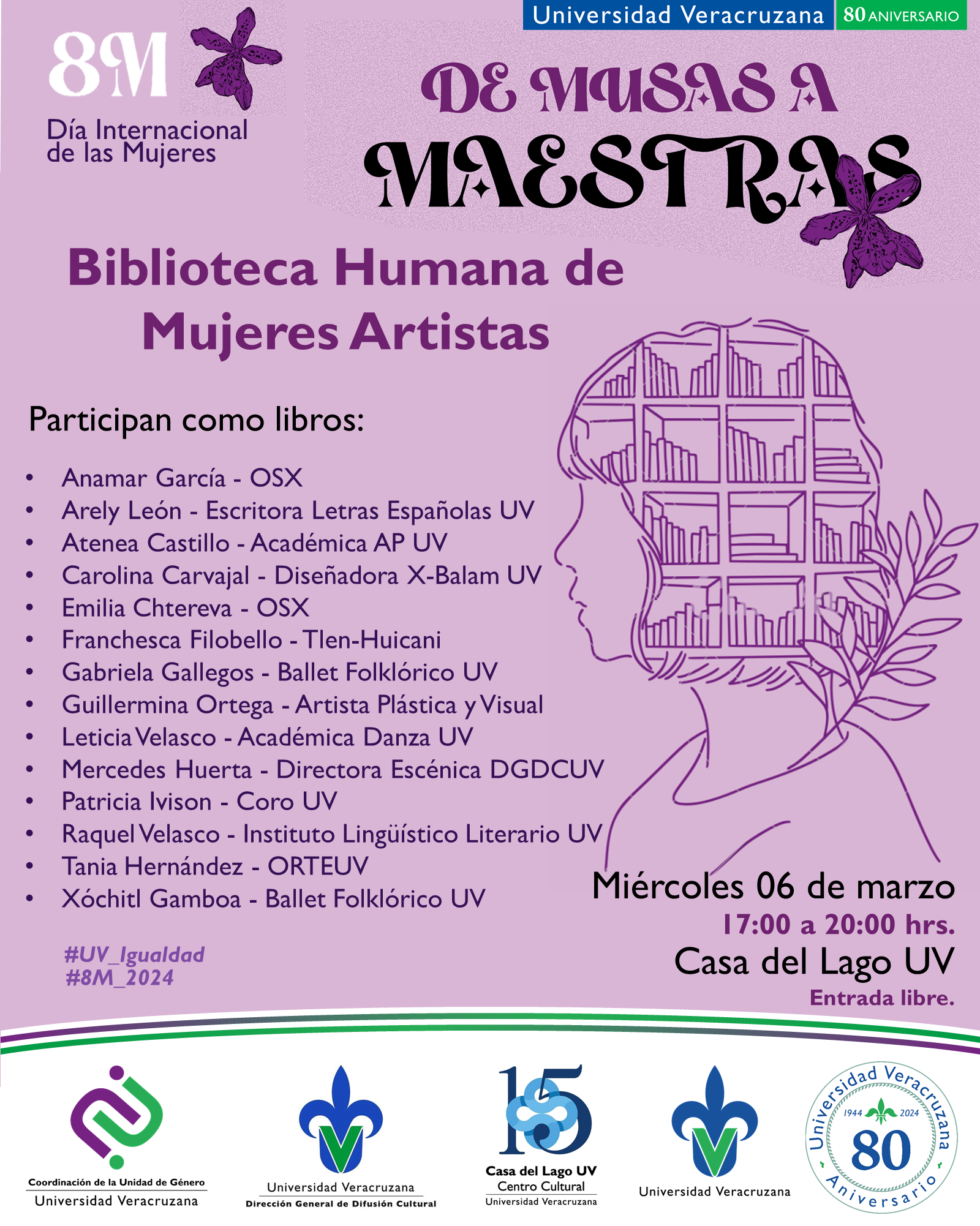 Carlos Hugo Hermida Rosales Fotos: José Rujiro Hernández Temis 06/03/2024. Xalapa, Ver. Creadoras de diversas disciplinas integraron una Biblioteca Humana de Mujeres Artistas en el marco del evento “De musas a maestras. Por el reconocimiento de las mujeres en las artes”, organizado por la Coordinación de la Unidad de Género de la Universidad Veracruzana (UV), en conmemoración del Día Internacional de la Mujer. Las participantes fueron Anamar García y Emilia Chtereva, de la Orquesta Sinfónica de Xalapa (OSX); Arely León, de la Facultad de Letras Españolas; Atenea Castillo, de la Facultad de Artes Plásticas; Carolina Carvajal, diseñadora del Laboratorio X-Balam; Franchesca Filobello, de Tlen Huicani; Gabriela Gallegos y Xóchitl Gamboa del Ballet Folklórico y Guillermina Ortega, artista plástica. Además, se sumaron Leticia Velasco, de la Facultad de Danza; Mercedes Huerta, directora escénica; Patricia Ivison, del Coro UV, y Tania Hernández, de la Organización Teatral de esta casa de estudios (Orteuv). |