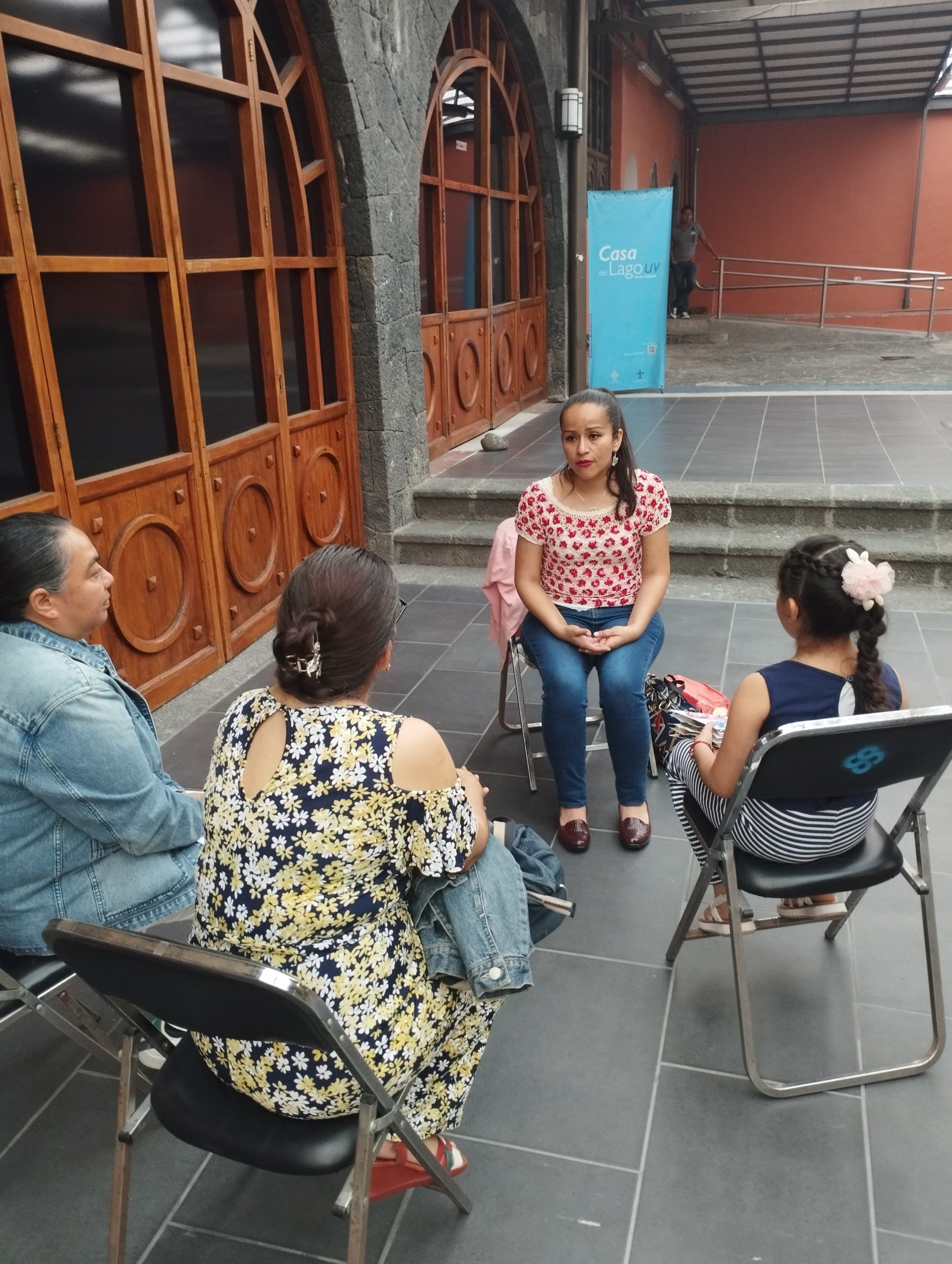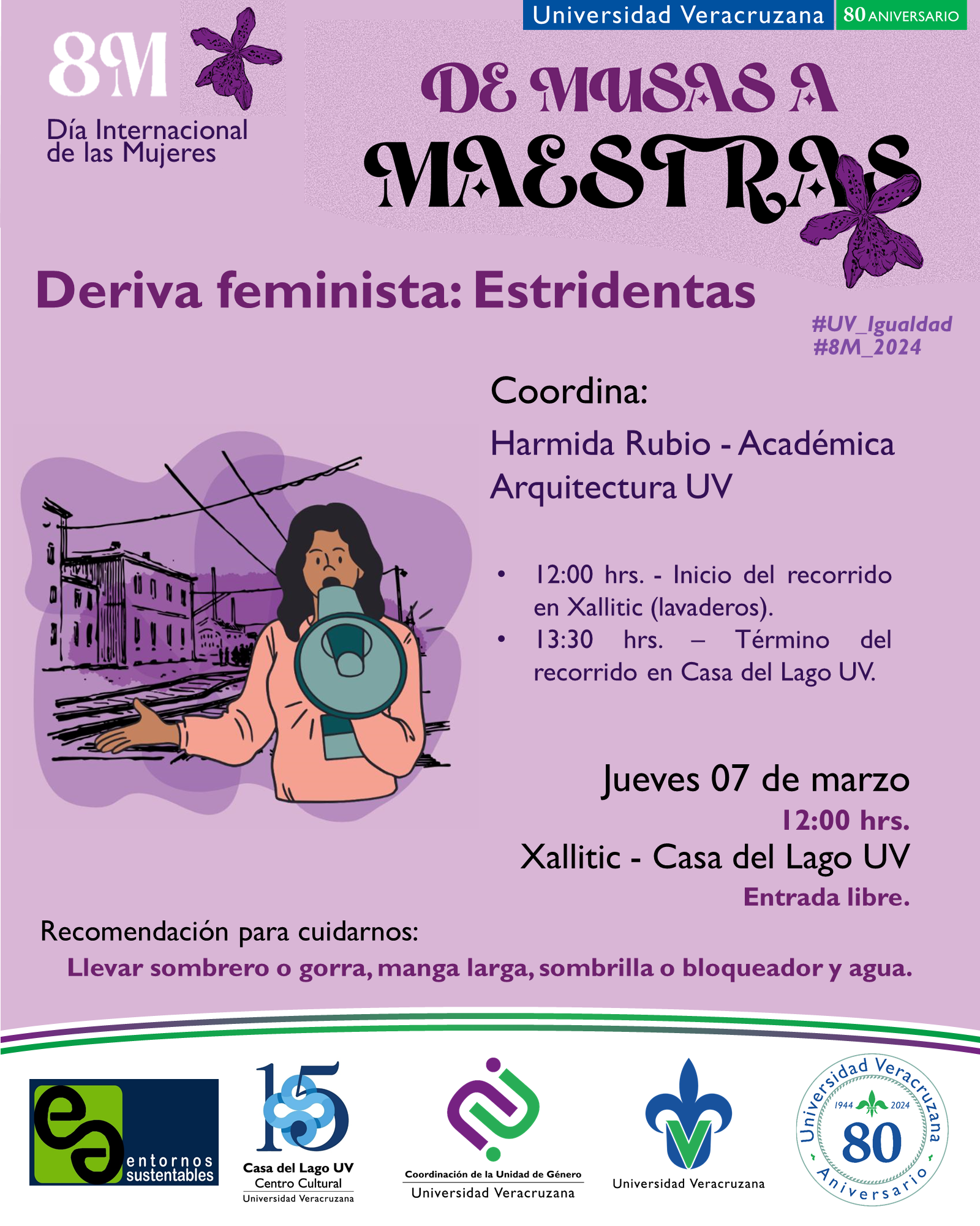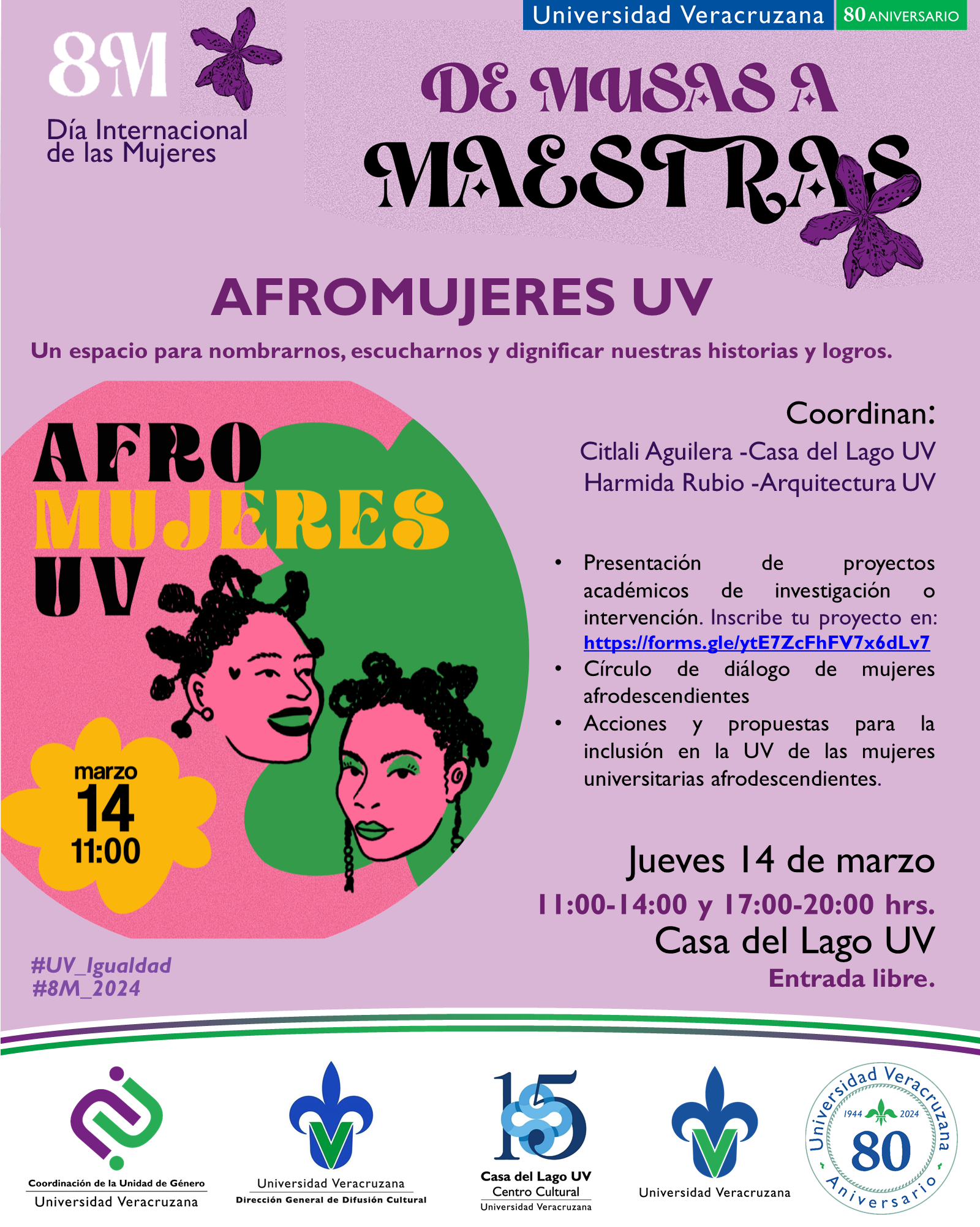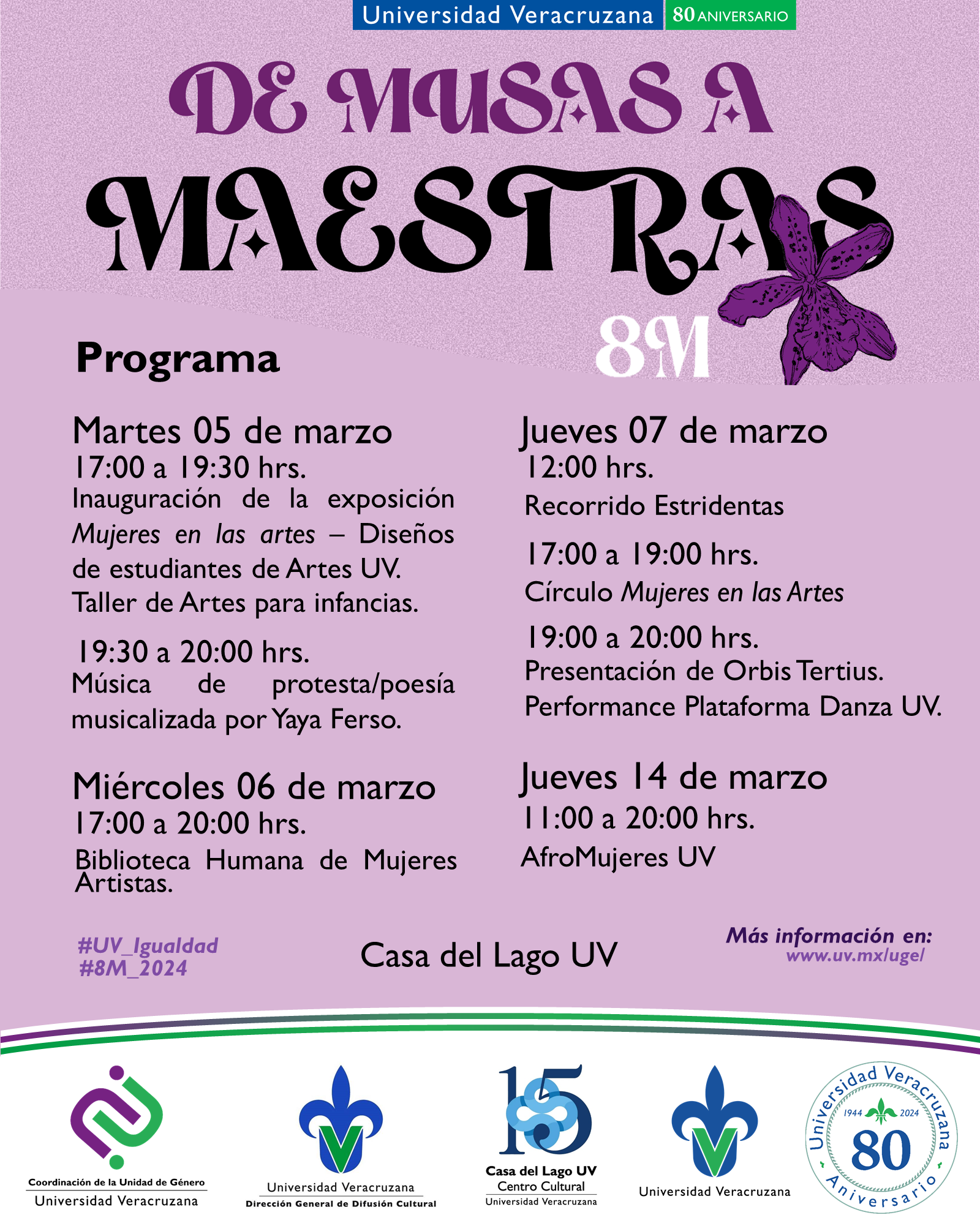 Carlos Hugo Hermida Rosales Fotos: José Rujiro Hernández Temis 06/03/2024. Xalapa, Ver. Creadoras de diversas disciplinas integraron una Biblioteca Humana de Mujeres Artistas en el marco del evento “De musas a maestras. Por el reconocimiento de las mujeres en las artes”, organizado por la Coordinación de la Unidad de Género de la Universidad Veracruzana (UV), en conmemoración del Día Internacional de la Mujer. Las participantes fueron Anamar García y Emilia Chtereva, de la Orquesta Sinfónica de Xalapa (OSX); Arely León, de la Facultad de Letras Españolas; Atenea Castillo, de la Facultad de Artes Plásticas; Carolina Carvajal, diseñadora del Laboratorio X-Balam; Franchesca Filobello, de Tlen Huicani; Gabriela Gallegos y Xóchitl Gamboa del Ballet Folklórico y Guillermina Ortega, artista plástica. Además, se sumaron Leticia Velasco, de la Facultad de Danza; Mercedes Huerta, directora escénica; Patricia Ivison, del Coro UV, y Tania Hernández, de la Organización Teatral de esta casa de estudios (Orteuv). |
