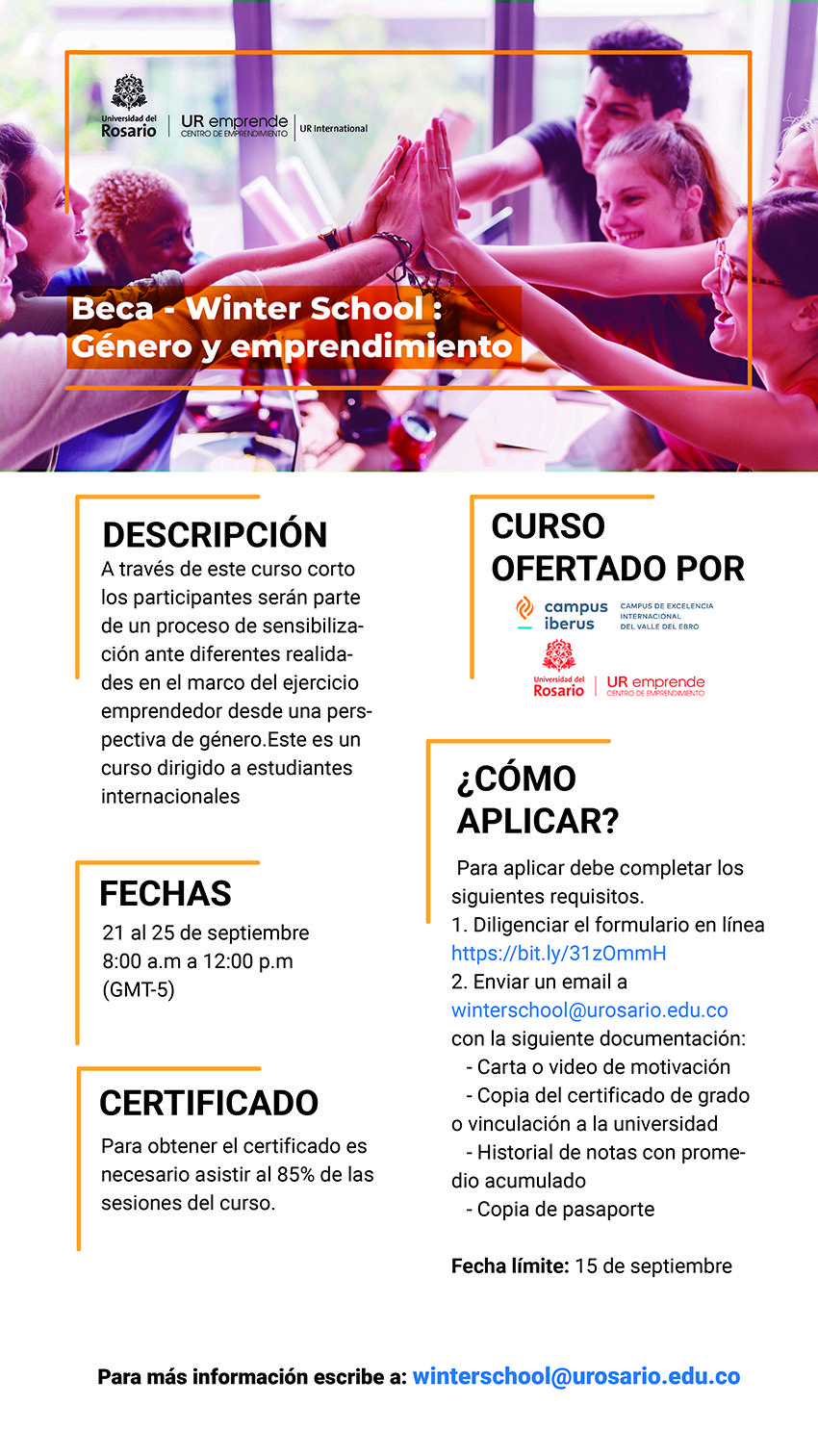 Para mayor información: https://www.urosario.edu.co/Winter-School/Genero-y-Emprendimiento/