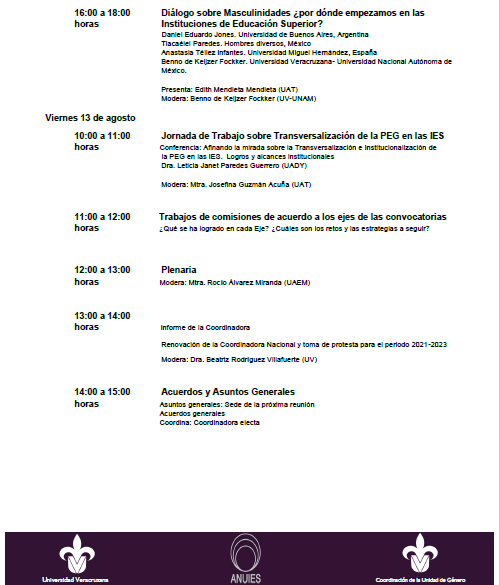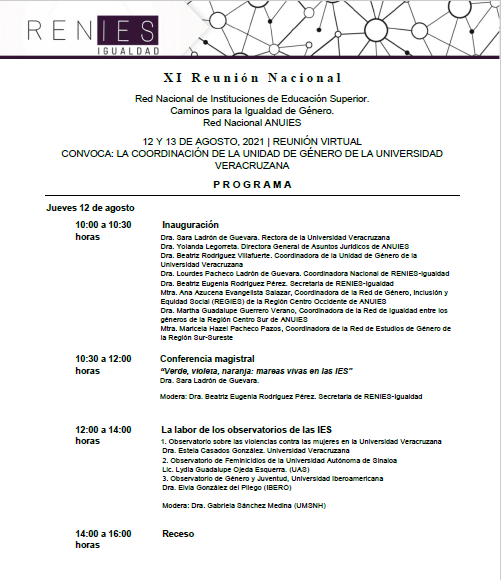 Este año la Universidad Veracruzana fue la institución convocante de la XI Reunión Nacional de la Red Nacional de Instituciones de Educación Superior – Caminos para la Igualdad de Género (RENIES-Igualdad), cuyos trabajos se desarrollaron en modalidad virtual los días 12 y 13 de agosto de 2021 siguiendo el programa que se presenta a continuación.