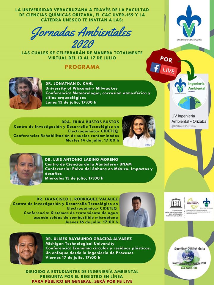 La Universidad Veracruzana, a través de la Facultad de Ciencias Químicas de Orizaba, el Cuerpo Académico UVER-159 T y la Cátedra UNESCO sobre Ciudadanía, Educación y Sustentabilidad del Desarrollo, realizó de manera virtual el evento denominado Jornadas Ambientales 2020, las cuales se celebraron del 13 al 17 de julio.