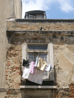 balcones y ropa tendida, que se balancea sobre la calle con peligro