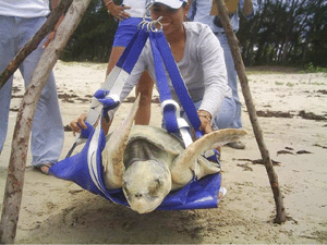 Alumnos marcan, pesan y miden a las hembras de tortugas lora