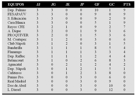 Resultados de la fecha 3: Águilas Dique 5; Real Madrid 0; Casa Blanca 3; Cafeteros de Coatepec 1; Deportivo Banderilla 5, Laboratorio Diesel Galindo 0; Flamengo 0; Proquiver 2; Nápoli 2, Dos de Abril 0; Las Palmas 2, Pumas Progreso 0; Rafluc 0, FESAPAUV 3; Rayos CFE 2; Deportivo Nápoli 0; Secretaría de Educación 3; Betancourt 2; Águilas del Dique 5; Real Madrid 0.
