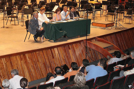 El rector de la Universidad Veracruzana (UV), doctor Raúl Arias Lovillo, se reunió en el Teatro del Estado con los integrantes de la Orquesta Sinfónica de Xalapa (OSX) para intercambiar puntos de vista sobre las alternativas para construir mejores condiciones para que la producción sinfónica alcance a más sectores sociales y, al mismo tiempo, para que la Orquesta consolide su prestigio y sus miembros gocen de mejores condiciones económicas. A la reunión asistió el presidente del Patronato Pro-OSX, Héctor Salmerón Roiz, el director titular Carlos Miguel Prieto, la directora de Desarrollo Académico, Leticia Rodríguez Audirac, y el director de Difusión Cultural, Manuel Zepeda, entre otros funcionarios.