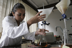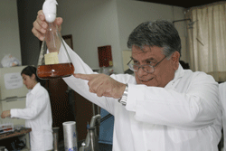 Escamirosa Gutiérrez analiza en el matraz el destilado del