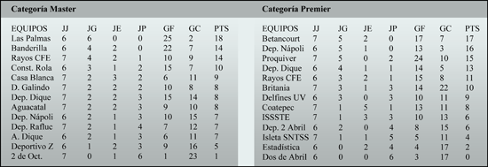 1; Las Palmas 3, Dique 1; Rayos CFE 2, Diesel Galindo 1.